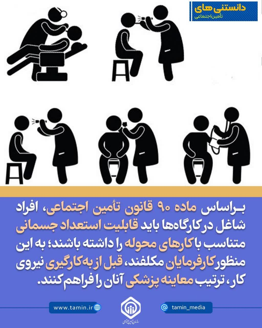 معرفی فرد استخدام شده توسط کارفرما به مراکز طب کار پس از مشخص کردن عنوان شغلی وی، مراجعه بیمه شده به این مراکز و انجام معاینات تناسب شغلی و ارسال نتیجه معاینات سلامت شغلی قبل از استخدام بیمه‌شده توسط کارفرما به سازمان تأمین اجتماعی، فرایند انجام معاینات پزشکی طبق ماده ۹۰ قانون تأمین اجتماعی را تشکیل می‌دهند.