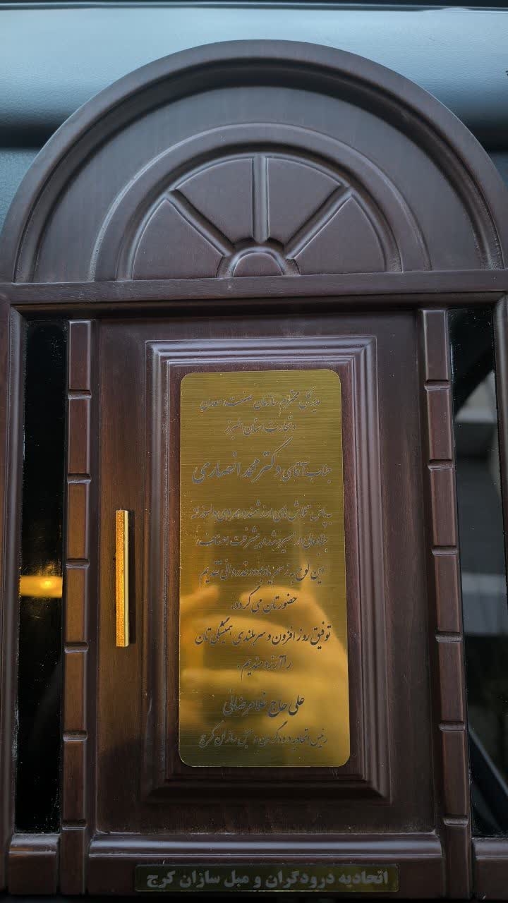 «به پاس تلاش‌های ارزشمند و همراهی دلسوزانه جنابعالی در مسیر رشد و پیشرفت اصناف، این لوح به رسم یادبود و قدردانی تقدیم حضورتان می‌گردد. توفیق روزافزون و سربلندی همیشگی‌تان را آرزومندیم.»این لوح به امضای علی حاج غلامرضائی، رئیس اتحادیه درودگران و مبل‌سازان کرج، تقدیم شد.برگزاری این همایش، گامی مؤثر در راستای تقویت تعامل میان بخش دولتی و اصناف، ارتقاء سطح مهارت‌های حرفه‌ای و حمایت از جایگاه هنر–صنعت چوب و مبلمان در استان البرز ارزیابی می‌شود.