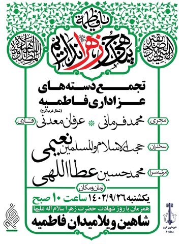 محمدرضا آژیر اظهار کرد: مراسم سوگواری و عزاداری بانوی دو عالم حضرت زهرا(س) همه ساله با حضور خیل عظیمی از عاشقان و سوگواران آن بزرگوار در میدان فاطمیه شاهین ویلا کرج برگزار می‌شود.مدیر منطقه ۶ کرج هدف از این تجمع را تعظیم و بزرگداشت شعائر فاطمی و عاشورایی برگزار کردن ایام فاطمیه عنوان و خاطرنشان کرد: گرامیداشت جایگاه شهیده میدان فتنه و ظلم زمانه، حضرت فاطمه زهرا (س) و نشان دادن غربت و مظلومیت و اوج غم‌های خاندان رسول الله(ص) به جهانیان یکی از مهمترین انگیزه‌های شکل‌گیری چنین اجتماع بزرگی از مساجد و هیئت‌های مذهبی سطح منطقه به شمار می‌رود.وی با اشاره به این مطلب که اگر عاشورای فاطمی نبود، عاشورای حسینی وجود نداشت، لذا ترویج عظمت دهه فاطمیه یک وظیفه شرعی به‌شمار می‌رود، اظهار کرد: فضاسازی و سیاه‌پوشی محل برگزاری مراسم در دستور کار قرار دارد و همچنین روز مراسم‌ایستگاه‌های صلواتی در میدان امام فاطمیه جهت پذیرایی از عزاداران مستقر می‌شوند.این مسئول تصریح کرد: هیئت‌های مختلف مذهبی، مساجد و پایگاه‌های بسیج به این مراسم ملحق می‌شوند تا مراسم هرچه باشکوه‌تر برگزار شود و همچنین در طول مسیر راهپیمایی مداحان اهل بیت(ع) به مرثیه خوانی و ذکر مصیبت حضرت زهرا(س) خواهند پرداخت.آژیر در پایان یادآور شد: این مراسم ساعت ۱۰ صبح روز یکشنبه (۲۶ آذر) در میدان فاطمیه برگزار می‌شود.