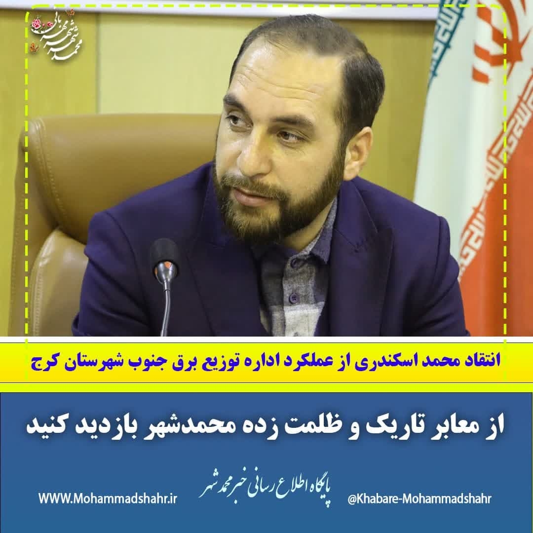 محمد اسکندری عضو شورای اسلامی محمدشهر ضمن انتقاد از عملکرد اداره توزیع برق جنوب شهرستان کرج در ارائه خدمات به شهروندان، از مسئولان استانی این نهاد تقاضا کرد که شب ها بازدیدی از معابر تاریک و ظلمت زده محمدشهر داشته و از مشکلات ساکنین این مناطق را از نزدیک لمس و رصد نمایند.
