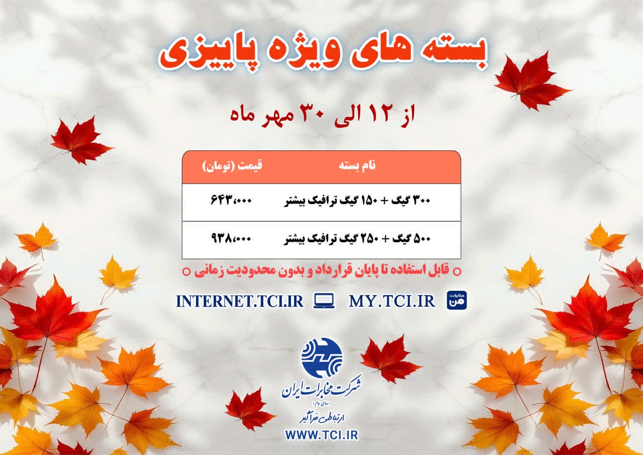 شرکت مخابرات ایران، کمپین پاییزه اینترنت پرسرعت خود را تحت عنوان ارمغان پاییزی برای مشتریان فعلی و مشتریان جدید از دهم آبان ماه اجرا می کند.