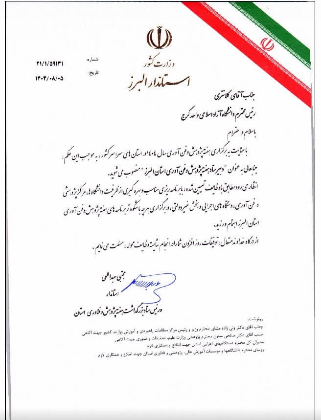 «با عنایت به برگزاری هفته پژوهش و فناوری سال ۱۴۰۴ در استانهای سراسر کشور، به موجب این حکم جنابعالی به عنوان دبیر ستاد هفته پژوهش و فناوری استان البرز منصوب میشوید. انتظار میرود مطابق با وظایف تعیینشده و با برنامهریزی مناسب، از ظرفیت دانشگاهها، مراکز پژوهش و فناوری، دستگاههای اجرایی و بخش غیردولتی در برگزاری هرچه باشکوهتر برنامههای هفته پژوهش و فناوری استان البرز بهرهمند شوید.»هفته پژوهش و فناوری هر سال با هدف ترویج فرهنگ پژوهش، تجلیل از پژوهشگران و فناوران برتر، و تقویت ارتباط میان دانشگاه، صنعت و جامعه در سراسر کشور برگزار میشود. این رویداد فرصت ارزشمندی برای نمایش دستاوردهای علمی و فناورانه و ایجاد تعامل میان نهادهای علمی، اجرایی و اقتصادی استان به شمار میرود.لازم به ذکر است در سال های 1401 و 1402 ستاد هفته پژوهش استان البرز با میزبانی دانشگاه آزاد اسلامی واحد کرج توانسته بود رتبه برتری کشور را در برگزاری این مراسم از آن خود کند.
