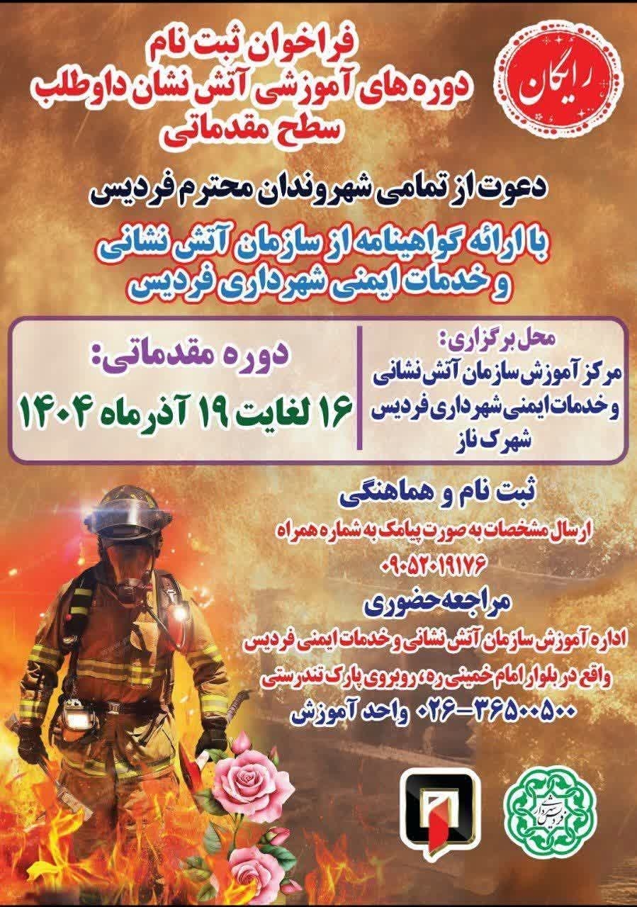 سازمان آتشنشانی و خدمات ایمنی شهرداری فردیس با هدف ارتقای سطح فرهنگی ایمنی دوره های آموزشی آتش نشان داوطلب در سطح مقدماتی به صورت رایگان و با ارائه گواهینامه برای شهروندان برگزار می کند.این دوره آموزشی از ۱۶ تا ۱۹ آذرماه امسال در مرکز آموزش سازمان آتش نشانی و خدمات ایمنی شهرداری فردیس واقع در شهرک ناز برگزار میشود.