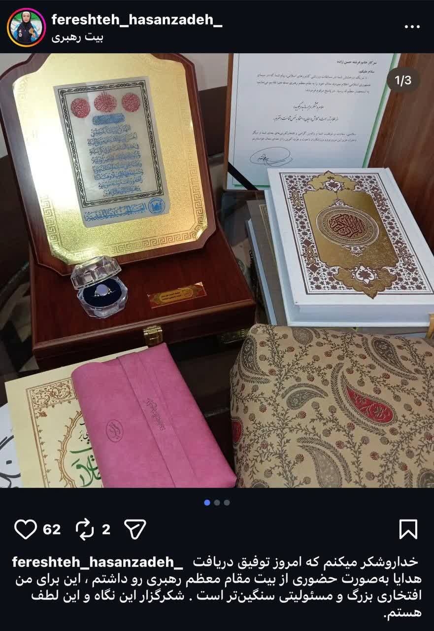 فرشته حسن‌زاده بانوی موی‌تای کار کشورمان که در بازی‌های کشورهای اسلامی صاحب مدال نقره شد، در صفحه شخصی خود تصاویری از هدایایی که از سوی دفتر رهبر انقلاب به او داده شده، منتشر کرد.