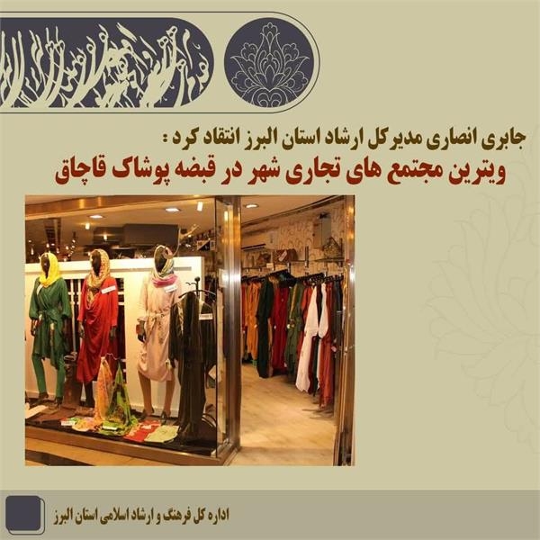 مدیرکل فرهنگ و ارشاد اسلامی استان البرز با تاکید برضرورت نظارت و بازرسی از مراکز عرضه پوشاک در سطح شهر گفت: متاسفانه ویترین فروشگاه ها و مجتمع های بزرگ درقبضه پوشاک قاچاق قرار دارد و باید ستاد ساماندهی ویترین ها و مانکن های مغازه های سطح شهر میدانی تشکیل شود و بازرسانی متشکل از اتحادیه، اتاق اصناف و نمایندگان سایر دستگاههای مرتبط بازدید از وضعیت موجود ویترین های عرضه پوشاک در سطح شهر را در دستور کار قرار دهند.
