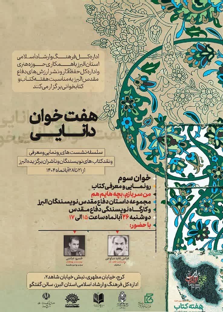 سومین خوان از برنامه‌های فرهنگی "هفت‌خوان دانایی" عصر دوشنبه بیست‌وششم آبان‌ماه با مشارکت اداره‌کل حفظ آثار و نشر ارزش‌های دفاع مقدس استان البرز و همکاری حوزه هنری، در سالن گفتگوی اداره‌کل فرهنگ و ارشاد اسلامی البرز، برگزار شد. این نشست که به مناسبت سی ‌و سومین هفته کتاب و کتاب‌خوانی جمهوری اسلامی ایران برگزار گردید، محور خود را بر رونمایی از مجموعه‌داستان دفاع مقدس "من سرباز بچه‌هایم هم" و برگزاری کارگاه آموزشی داستان‌نویسی دفاع مقدس استوار ساخته بود؛ تمرینی ارزشمند برای بازنمایی ادبی مفاهیم ایثار و مقاومت در قالب روایت‌های کوتاه و هنری. در این برنامه، نویسندگان و پژوهشگران ادبی از جمله خسرو عباسی ـ نویسنده و فعال حوزه داستانی با آثار متعدد در زمینه روایت‌های انسانی و محلی و عباس عابد ساوجی ـ منتقد و پژوهشگر ادبی با تمرکز بر سیر روایت‌های مقاومت و بازخوانی ادبیات جنگ ـ حضور داشتند و درباره ظرفیت‌های ادبی دفاع مقدس در انتقال مفاهیم ارزشی به نسل جوان به گفت‌وگو پرداختند. در پایان مراسم، به پاس تلاش نویسندگان البرزی در گسترش فرهنگ مطالعه و صیانت از میراث معنوی دفاع مقدس، از جمعی از آنان تجلیل شد. این آیین فرهنگی جلوه‌ای از پیوند ایمان، قلم و اندیشه در فضای فرهنگی البرز بود. طرح هفت‌خوان دانایی از 21 تا ۲8 آبان‌ماه در قالب هفت نشست تخصصی با موضوع کتاب، ادب و فرهنگ در کرج برگزار می شود و هر خوان آن به معرفی و رونمایی آثاری از نویسندگان بومی اختصاص دارد؛ تلاشی هدفمند از سوی اداره‌کل فرهنگ و ارشاد اسلامی استان البرز برای ترویج فرهنگ کتاب‌خوانی و پاسداشت قلم‌های متعهد.