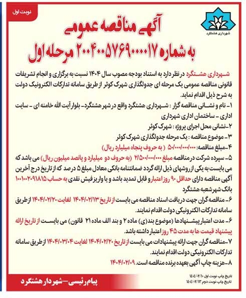 10 اردیبهشت 1404 شماره خبر: 323547 آگهی مناقصه عمومی شماره 2004005769000017 شهرداری هشتگرد سپیدارآنلاین: گروه مزایده و مناقصه آگهی مناقصه عمومی شماره 2004005769000017 شهرداری هشتگرد روزنامه پیام سپیدار شماره 2597 منتشر شد. نسخه قابل چاپ برچسب ها: آگهی مناقصه عمومی شماره 2004005769000017 شهرداری هشتگرد روزنامه پیام سپیدار شماره 2597 منتشر شد. مطالب مشابه: آگهی مناقصه عمومی شماره 2004005769000014 شهرداری هشتگرد روزنامه پیام سپیدار آگهی مناقصه عمومی شهرداری هشتگرد آگهی مناقصه عمومی شهرداری هشتگرد آگهی مناقصه عمومی شهرداری هشتگرد آگهی مناقصه عمومی شماره 2003005769000021 شهرداری هشتگرد
