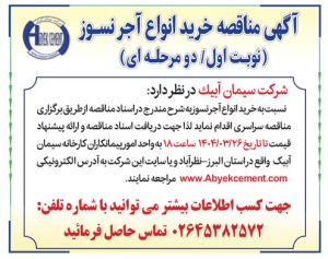 20 خرداد 1404 شماره خبر: 325999 آگهی مناقصه خرید انواع آجر نسوز شرکت سیمان آبیک سپیدارآنلاین: گروه مزایده و مناقصه آگهی مناقصه خرید انواع آجر نسوز شرکت سیمان آبیک روزنامه پیام سپیدار شماره 2625 منتشر شد. نسخه قابل چاپ برچسب ها: آگهی مناقصه خرید انواع آجر نسوز شرکت سیمان آبیک روزنامه پیام سپیدار شماره 2625 منتشر شد. مطالب مشابه: آگهی مناقصه خرید انواع بتن نسوز خطوط تولید شرکت سیمان آبیک آگهی مناقصه عمومی خرید انواع آجر نسوز خطوط تولید شرکت سیمانآبیک آگهی مناقصه نوبت دوم خرید انواع آجر نسوز خطوط تولید شرکت سیمان آبیک آگهی مناقصه عمومی خرید بتن نسوز شرکت سیمان آبیک آگهی مناقصه نسوز کاری خطوط تولید شرکت سیمان آبیک