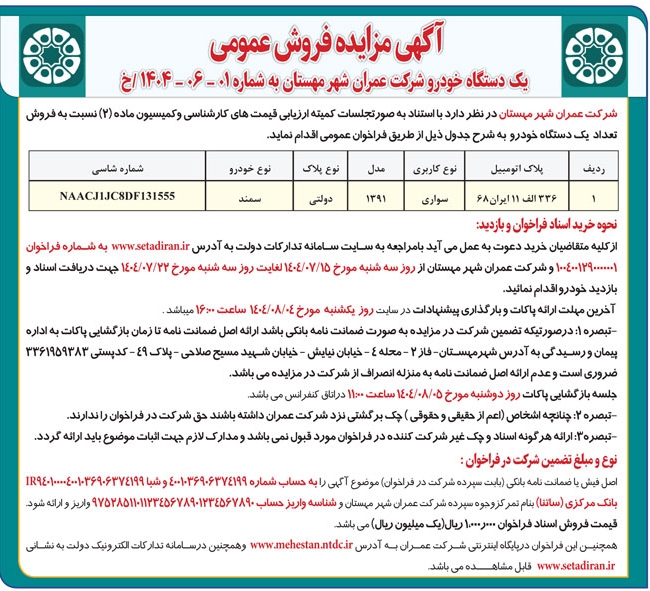 آگهی مزایده فروش عمومی یک دستگاه خودرو شرکت عمران شهر مهستان به شماره 01-06-1404 خ