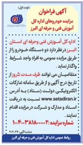 آگهی فراخوان مزایده خودروهای آموزش فنی و حرفه ای البرز