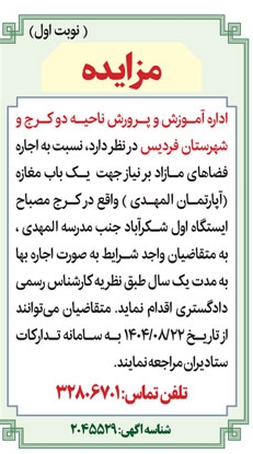 20 آبان 1404 شماره خبر: 334788 آگهی مزایده اداره آموزش و پرورش ناحیه دو کرج و فردیس سپیدارآنلاین: گروه مزایده و مناقصه آگهی مزایده اداره آموزش و پرورش ناحیه دو کرج و فردیس روزنامه پیام سپیدار شماره 2729 منتشر شد. نسخه قابل چاپ برچسب ها: آگهی مزایده اداره آموزش و پرورش ناحیه دو کرج و فردیس روزنامه پیام سپیدار شماره 2729 منتشر شد. مطالب مشابه: آگهی مزایده اداره آموزش و پرورش ناحیه دو کرج و فردیس آگهی مزایده فضاهای مازاد بر نیاز جهت مغازه تجاری در فردیس آموزش و پرورش ناحیه 2 کرج و فردیس آگهی مزایده اداره کل آموزش و پرورش استان البرز آگهی مزایده اداره کل آموزش و پرورش استان البرز روزنامه پیام سپیدار آگهی مزایده
