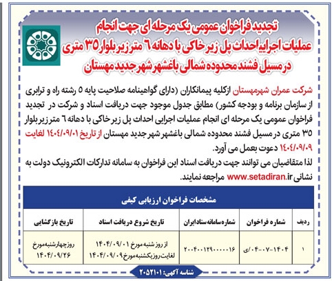 تجدید فراخوان های عمومی شرکت عمران شهر جدید مهستان