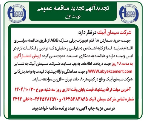 آگهی تجدیدآگهی تجدید مناقصه عمومی- نوبت اول شرکت سیمان آبیک