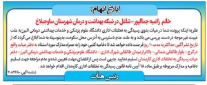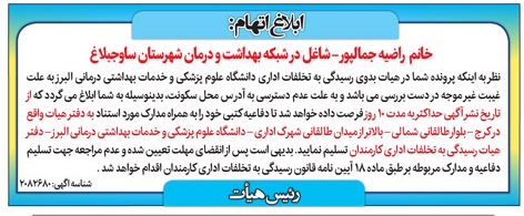 ابلاغ اتهام خانم راضیه جمالپور – شاغل در شبکه بهداشت و درمان شهرستان ساوجبلاغ