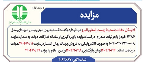 9 دی 1404 شماره خبر: 337805 آگهی مزایده مینی بوس هیوندای 1386 قابل شماره گذاری اداره کل محیط زیست البرز سپیدارآنلاین: گروه مزایده و مناقصه آگهی مزایده مینی بوس هیوندای 1386 قابل شماره گذاری اداره کل محیط زیست البرز شماره 2763 منتشر شد. نسخه قابل چاپ برچسب ها: آگهی مزایده مینی بوس هیوندای 1386 قابل شماره گذاری اداره کل محیط زیست البرز شماره 2763 منتشر شد. مطالب مشابه: آگهی مزایده -کد آگهی شماره 59-97 آگهی مزایده دو دستگاه خودرو اداره کل حفاظت محیط زیست استان البرز روزنامه پیام سپیدار آگهی مزایده شماره 24 - 97 آگهی مزایده فروش دو دستگاه وانت اداره کل حفاظت محیط زیست استان البرز آگهی مزایده شماره 6-97 سازمان ساماندهی مشاغل کرج