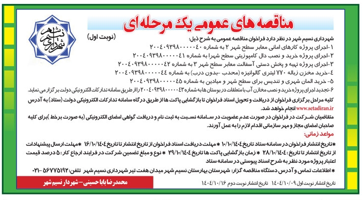 • آگهی مناقصه عمومی یک مرحله ای شهرداری نسیم شهر