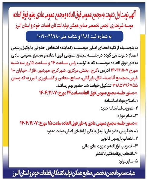 آگهی دعوت به مجمع عمومی موسسه غیرتجاری انجمن تخصصی صنایع همگن تولیدکنندگان قطعات خودرو استان البرز