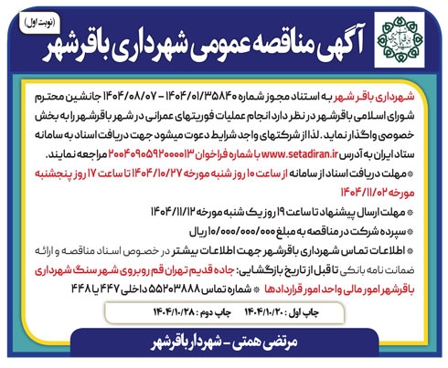 20 دی 1404 شماره خبر: 338303 آگهی مناقصه شهرداری باقرشهر سپیدارآنلاین: گروه مزایده و مناقصه آگهی مناقصه عمومی شهرداری باقرشهر روزنامه پیام سپیدار شماره 2769 منتشر شد. نسخه قابل چاپ برچسب ها: آگهی مناقصه عمومی شهرداری باقرشهر روزنامه پیام سپیدار شماره 2769 منتشر شد. مطالب مشابه: روزنامه پیام سپیدار آگهی مناقصه عمومی روزنامه پیام سپیدار آگهی مناقصه عمومی ,تجدید مناقصه عمومی و مزایده عمومی روزنامه پیام سپیدار آگهی مناقصه عمومی روزنامه پیام سپیدار آگهی مناقصه عمومی شهرداری کرج روزنامه پیام سپیدار آگهی مناقصه عمومی
