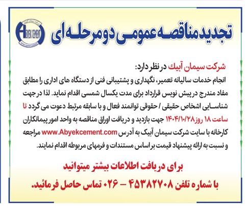 20 دی 1404 شماره خبر: 338304 آگهی تجدید مناقصه عمومی سیمان آبیک سپیدارآنلاین: گروه مزایده و مناقصه آگهی تجدید مناقصه عمومی سیمان آبیک روزنامه پیام سپیدار شماره 2769 منتشر شد. نسخه قابل چاپ برچسب ها: آگهی تجدید مناقصه عمومی سیمان آبیک روزنامه پیام سپیدار شماره 2769 منتشر شد. مطالب مشابه: آگهی تجدید مناقصه عمومی شرکت سیمان آبیک آگهی مناقصه عمومی شرکت سیمان آبیک آگهی مناقصه عمومی شرکت سیمان آبیک روزنامه پیام سپیدار آگهی مناقصه شرکت سیمان آبیک روزنامه پیام سپیدار آگهی تجدید مناقصه عمومی