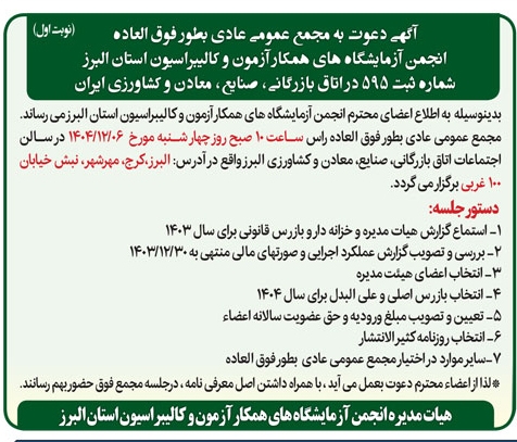 آگهی دعوت به مجمع عمومی عادی بطور فوق العاده انجمن آزمایشگاه های همکار آزمون و کالیبراسیون استان البرز