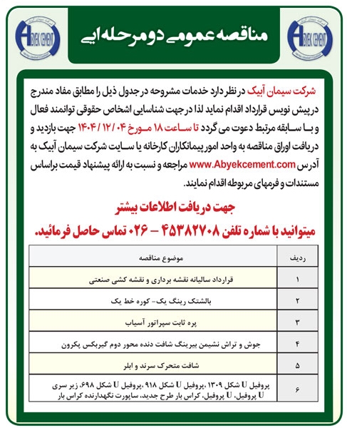 • آگهی مناقصه عمومی دو مرحله ای شرکت سیمان ابیک