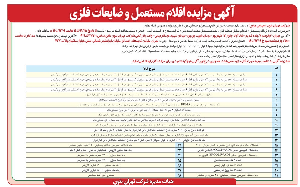 25 بهمن 1404 شماره خبر: 339731 آگهی مزایده اقلام مستعمل و ضایعات فلزی شرکت تهران بتون سپیدارآنلاین: گروه مزایده و مناقصه آگهی مزایده اقلام مستعمل و ضایعات فلزی شرکت تهران بتون روزنامه پیام سپیدار شماره 2791 منتشر شد. نسخه قابل چاپ برچسب ها: آگهی مزایده اقلام مستعمل و ضایعات فلزی شرکت تهران بتون روزنامه پیام سپیدار شماره 2791 منتشر شد. مطالب مشابه: آگهی مزایده اقلام مستعمل و ضایعاتی شرکت تهران بتون مزایده حضوری بخشی از اموال مازاد و مستعمل مزایده حضوری بخشی از اموال مازاد و مستعمل آگهی مزایده عمومی "فروش وانت و خودرو سنگین"شرکت تهران بتون آگهی مزایده عمومی اقلام مازاد و مستعمل دانشگاه آزاد اسلامی واحد کرج