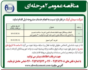 28 بهمن 1404 شماره خبر: 339924 آگهی مناقصه عمومی 2 مرحله ای شرکت سیمان آبیک سپیدارآنلاین: گروه مزایده و مناقصه آگهی مناقصه عمومی 2 مرحله ای شرکت سیمان آبیک روزنامه پیام سپیدار شماره 2794 منتشر شد نسخه قابل چاپ برچسب ها: آگهی مناقصه عمومی 2 مرحله ای شرکت سیمان آبیک روزنامه پیام سپیدار شماره 2794 منتشر شد مطالب مشابه: آگهی مناقصه عمومی شرکت سیمان آبیک آگهی مناقصه عمومی شرکت سیمان آبیک روزنامه پیام سپیدار آگهی مناقصه شرکت سیمان آبیک آگهی تجدید مناقصه عمومی شرکت سیمان آبیک آگهی مناقصه شرکت سیمان آبیک