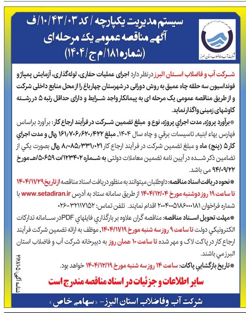 • آگهی مناقصه عمومی یک مرحله ای شماره 161/ ی ع/ 1404 شرکت آب و فاضلاب البرز