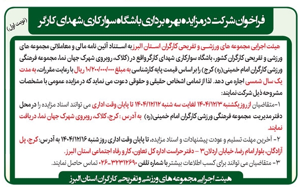 آگهی فراخوان شرکت در مزایده بهره برداری باشگاه سوارکاری شهدای کارگر روزنامه پیام سپیدار شماره 2797 منتشر شد.