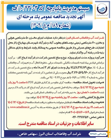 آگهی تجدید مناقصه عمومی یک مرحله ای شرکت آب و فاضلاب استان البرز شماره 189/ م ع/1404