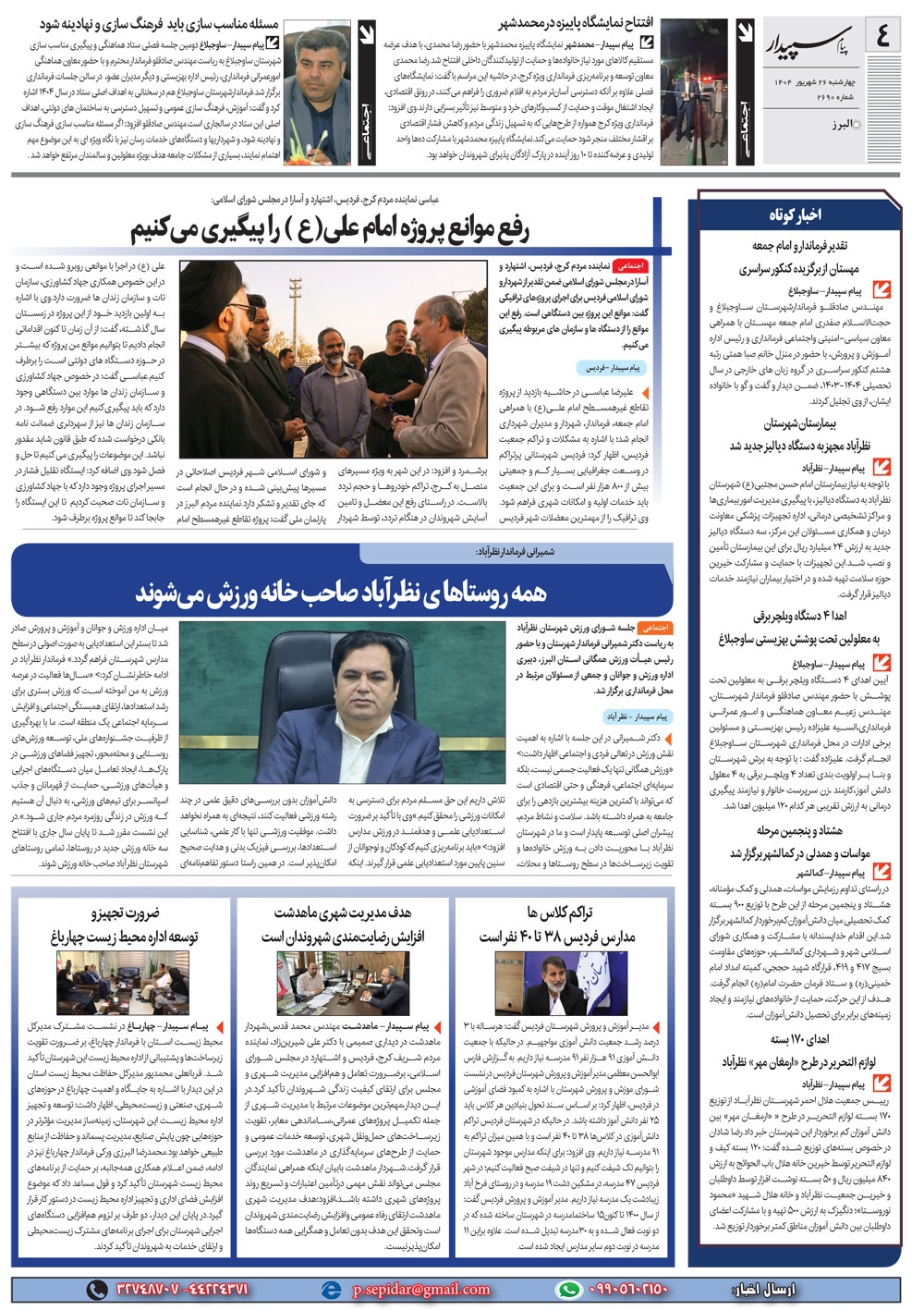 روزنامه پیام سپیدار شماره 2690 چهارشنبه بیست و ششم شهریور سال هزارو چهارصدو چهار منتشر شد و در دسترس مخاطبین قرار گرفت. روزنامه پیام سپیدار را می توانید از کیوسک های مطبوعاتی سطح شهر تهیه کنید.