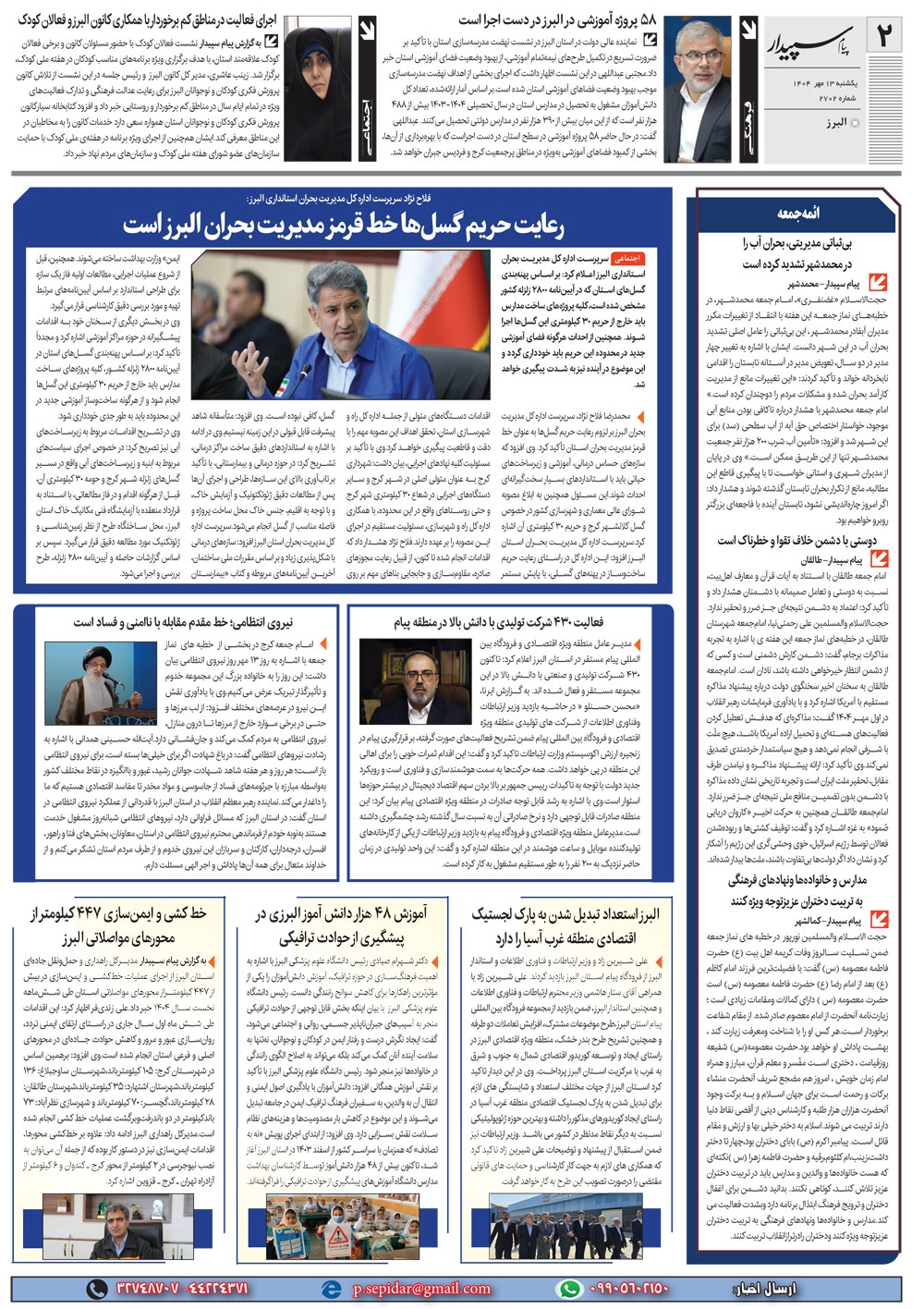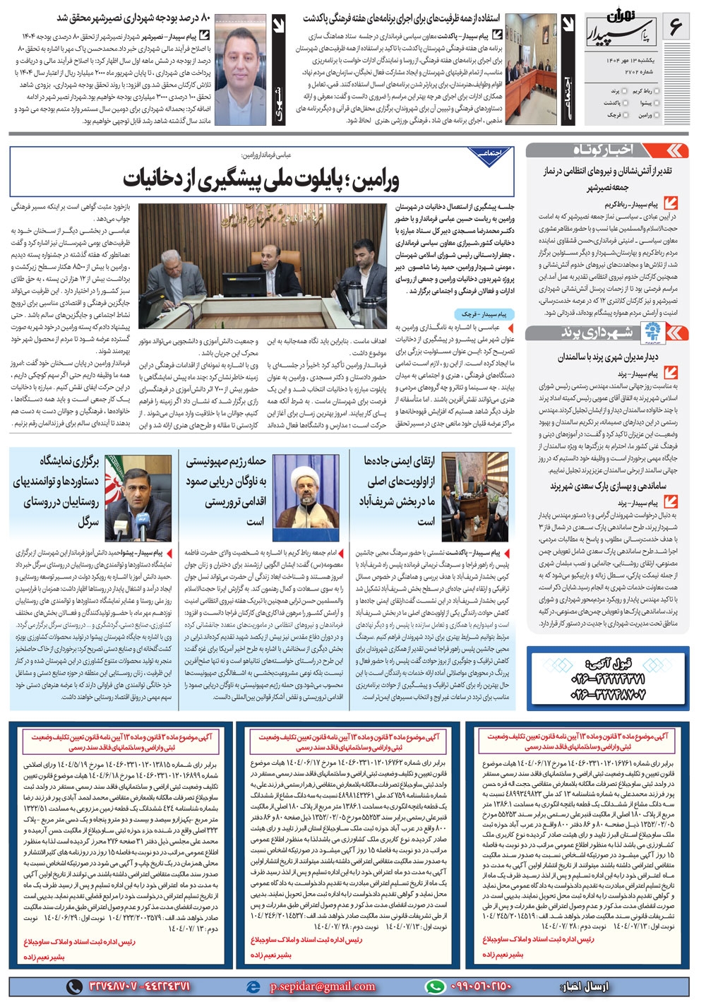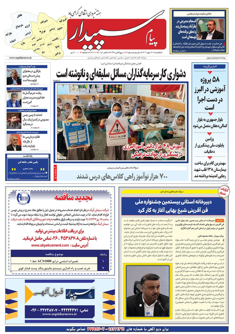 روزنامه پیام سپیدار شماره 2702 یکشنبه سیزدهم مهر سال هزارو چهارصدو چهار منتشر شد و در دسترس مخاطبین قرار گرفت. روزنامه پیام سپیدار را می توانید از کیوسک های مطبوعاتی سطح شهر تهیه کنید.