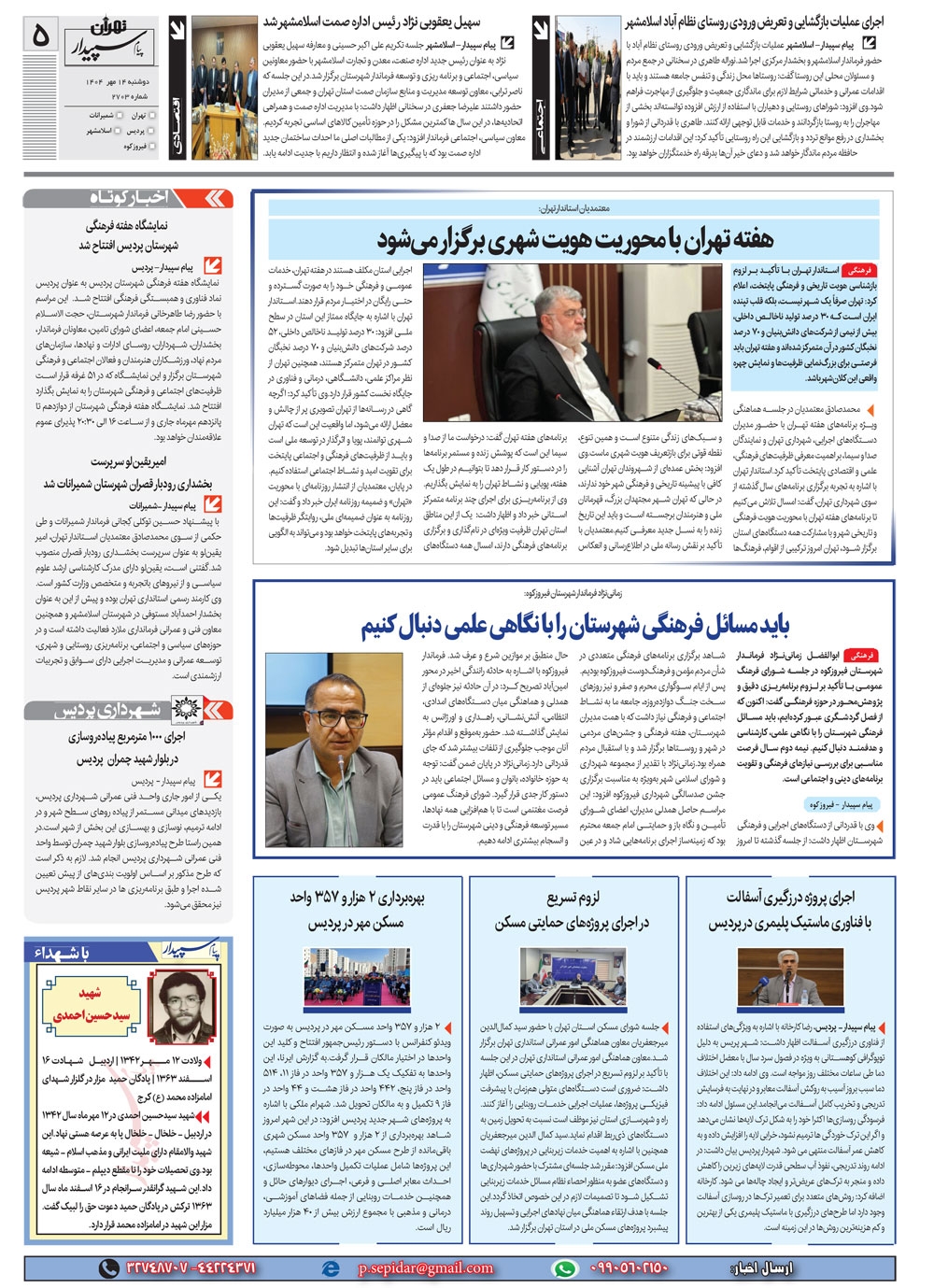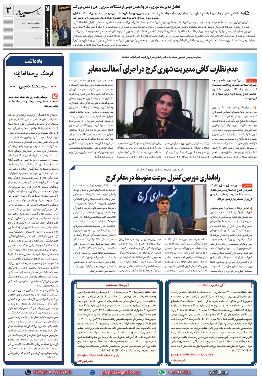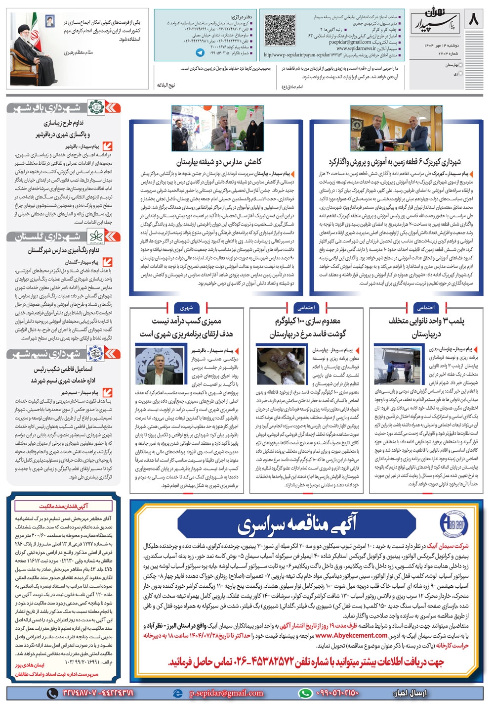 روزنامه پیام سپیدار شماره 2703 دوشنبه چهاردهم مهر سال هزارو چهارصدو چهار منتشر شد و در دسترس مخاطبین قرار گرفت. روزنامه پیام سپیدار را می توانید از کیوسک های مطبوعاتی سطح شهر تهیه کنید.