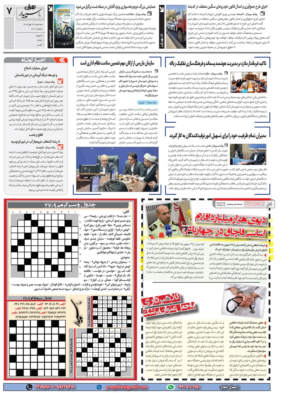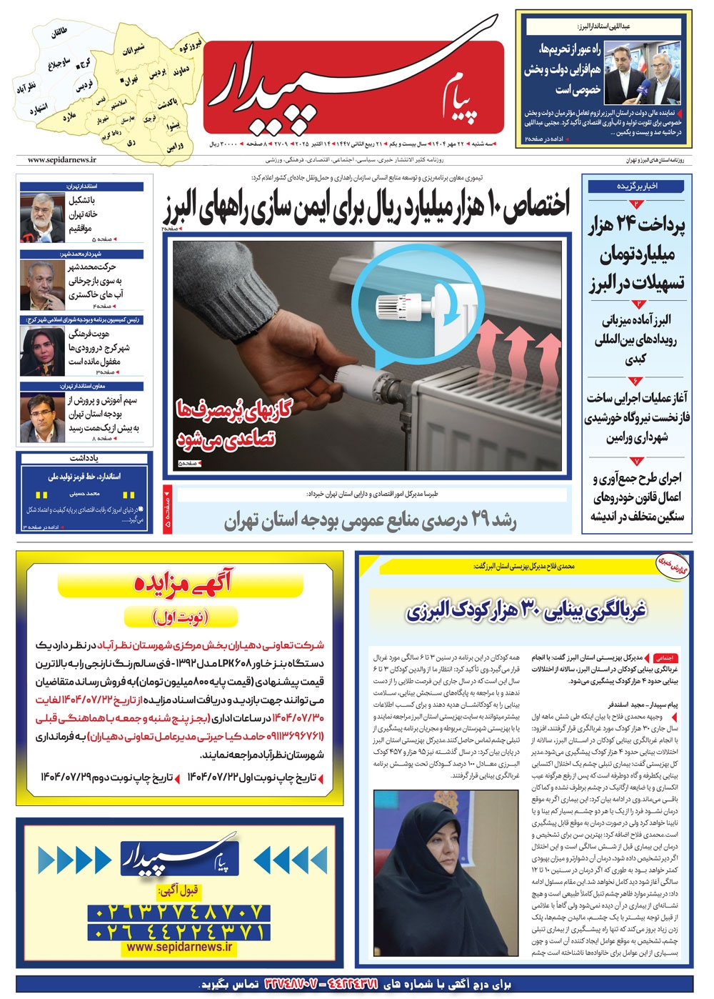 روزنامه پیام سپیدار شماره 2709 سه شنبه بیست و دوم مهر سال هزارو چهارصدو چهار منتشر شد و در دسترس مخاطبین قرار گرفت. روزنامه پیام سپیدار را می توانید از کیوسک های مطبوعاتی سطح شهر تهیه کنید.