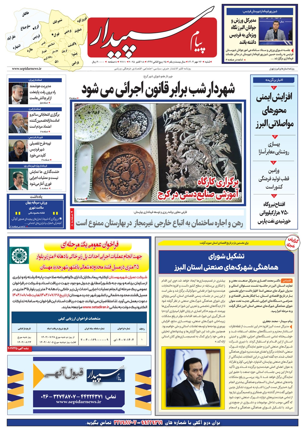روزنامه پیام سپیدار شماره 2711 شنبه بیست و ششم مهر سال هزارو چهارصدو چهار منتشر شد و در دسترس مخاطبین قرار گرفت. روزنامه پیام سپیدار را می توانید از کیوسک های مطبوعاتی سطح شهر تهیه کنید.