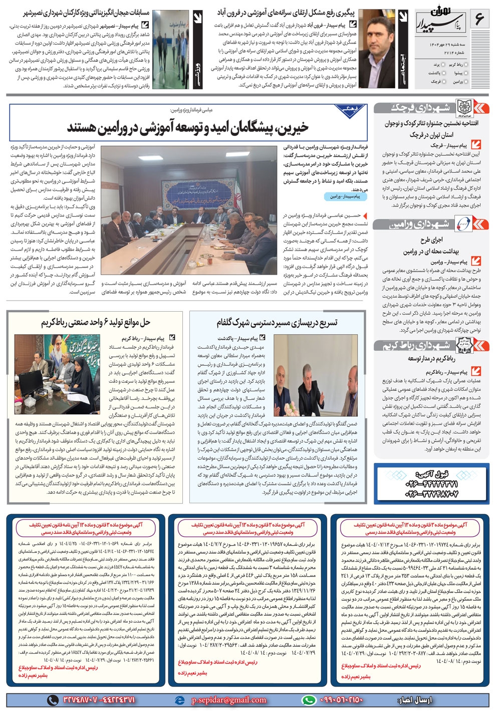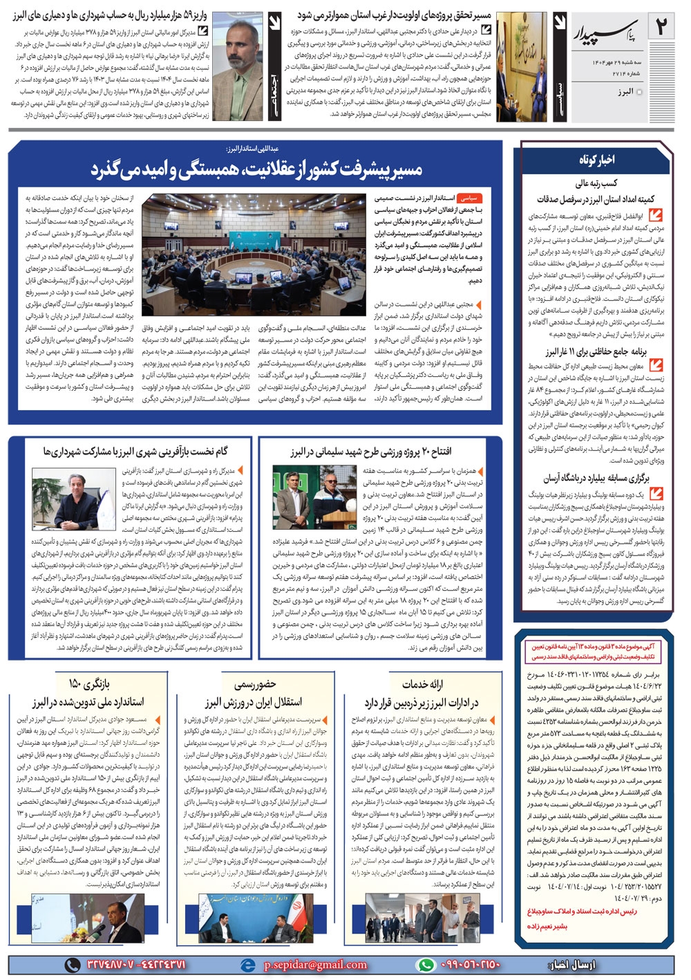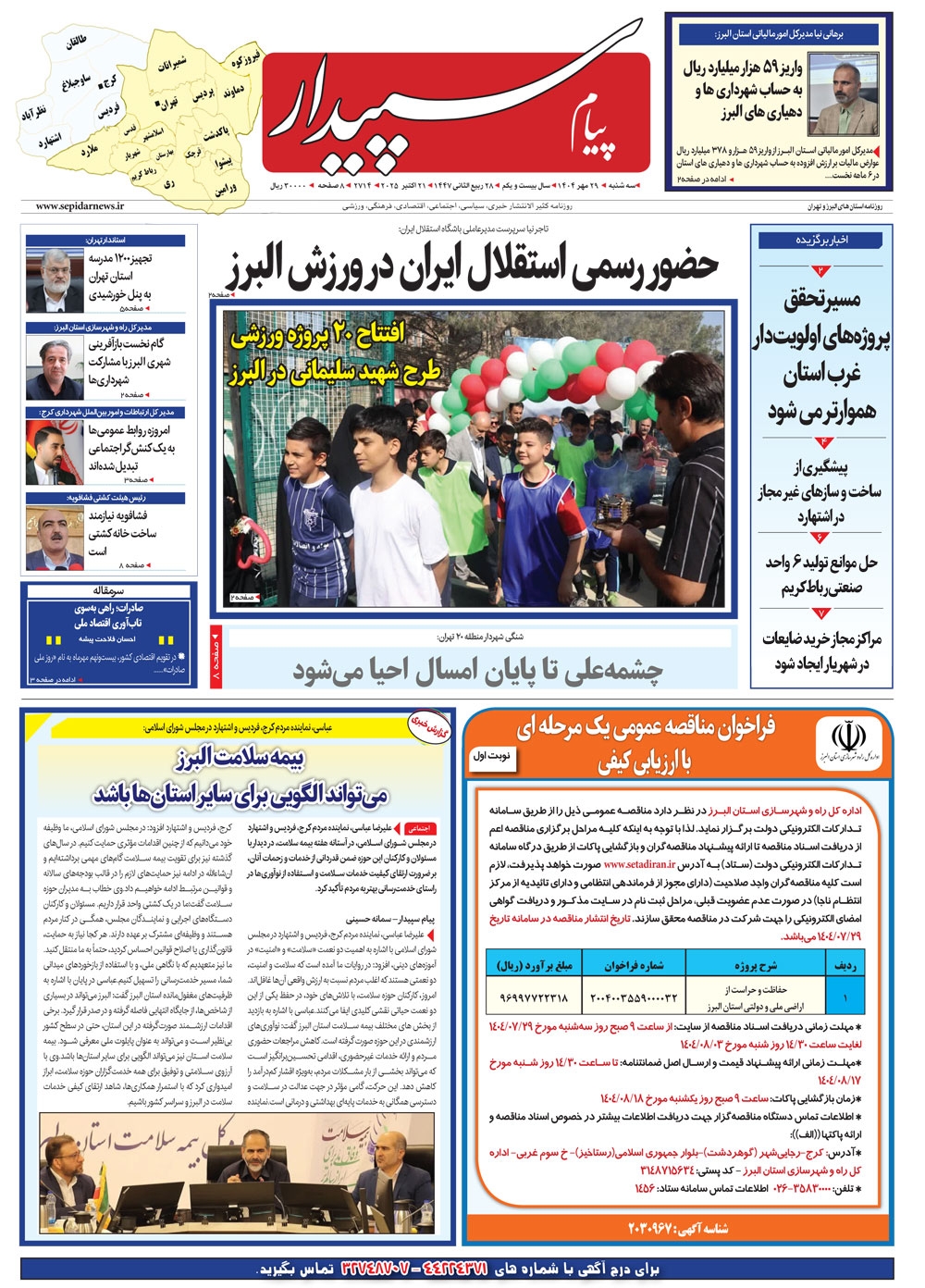 روزنامه پیام سپیدار شماره 2714سه شنبه بیست و نهم مهر سال هزارو چهارصدو چهار منتشر شد و در دسترس مخاطبین قرار گرفت. روزنامه پیام سپیدار را می توانید از کیوسک های مطبوعاتی سطح شهر تهیه کنید.