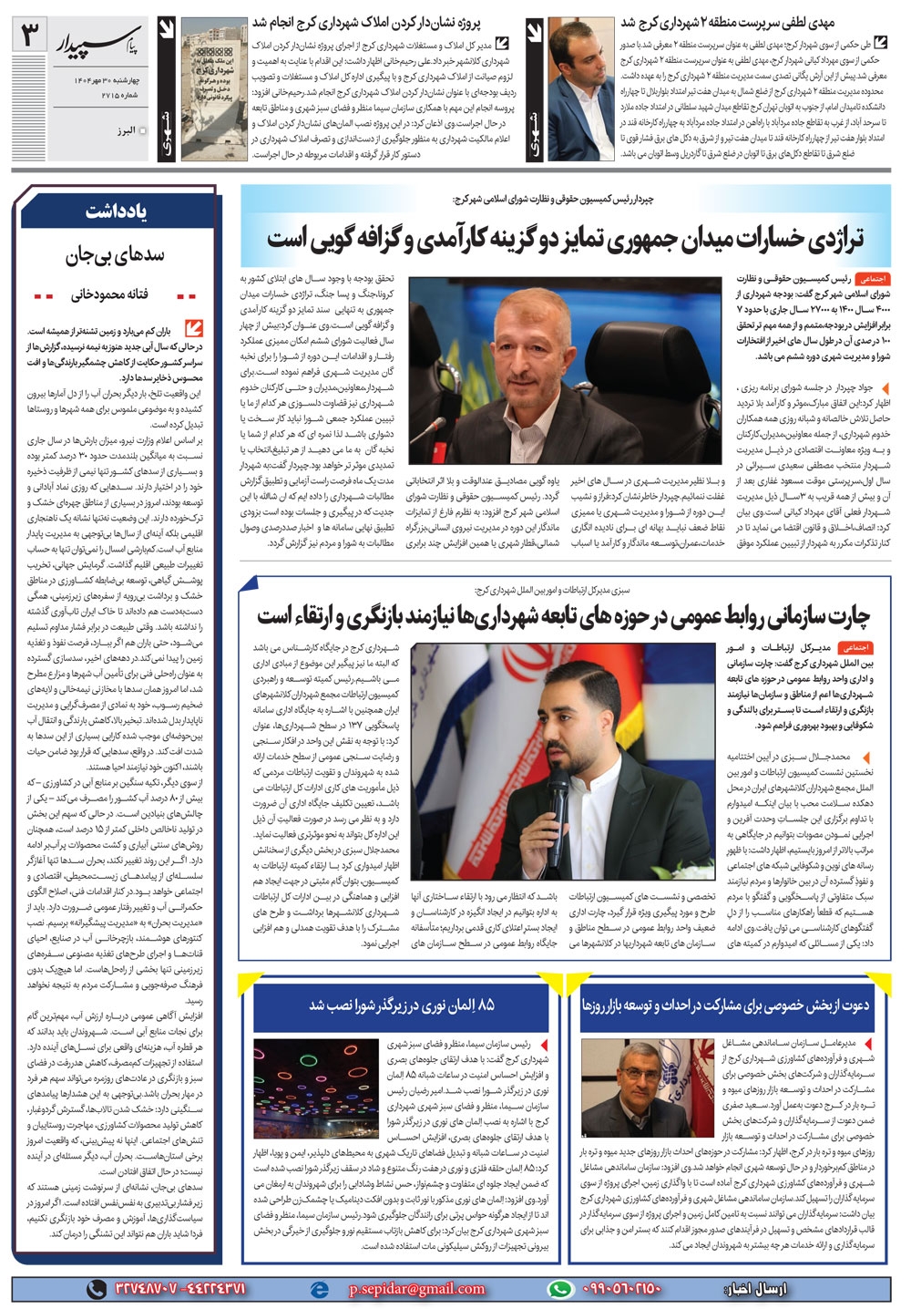 روزنامه پیام سپیدار شماره 2715 چهارشنبه سی ام مهر سال هزارو چهارصدو چهار منتشر شد و در دسترس مخاطبین قرار گرفت. روزنامه پیام سپیدار را می توانید از کیوسک های مطبوعاتی سطح شهر تهیه کنید.