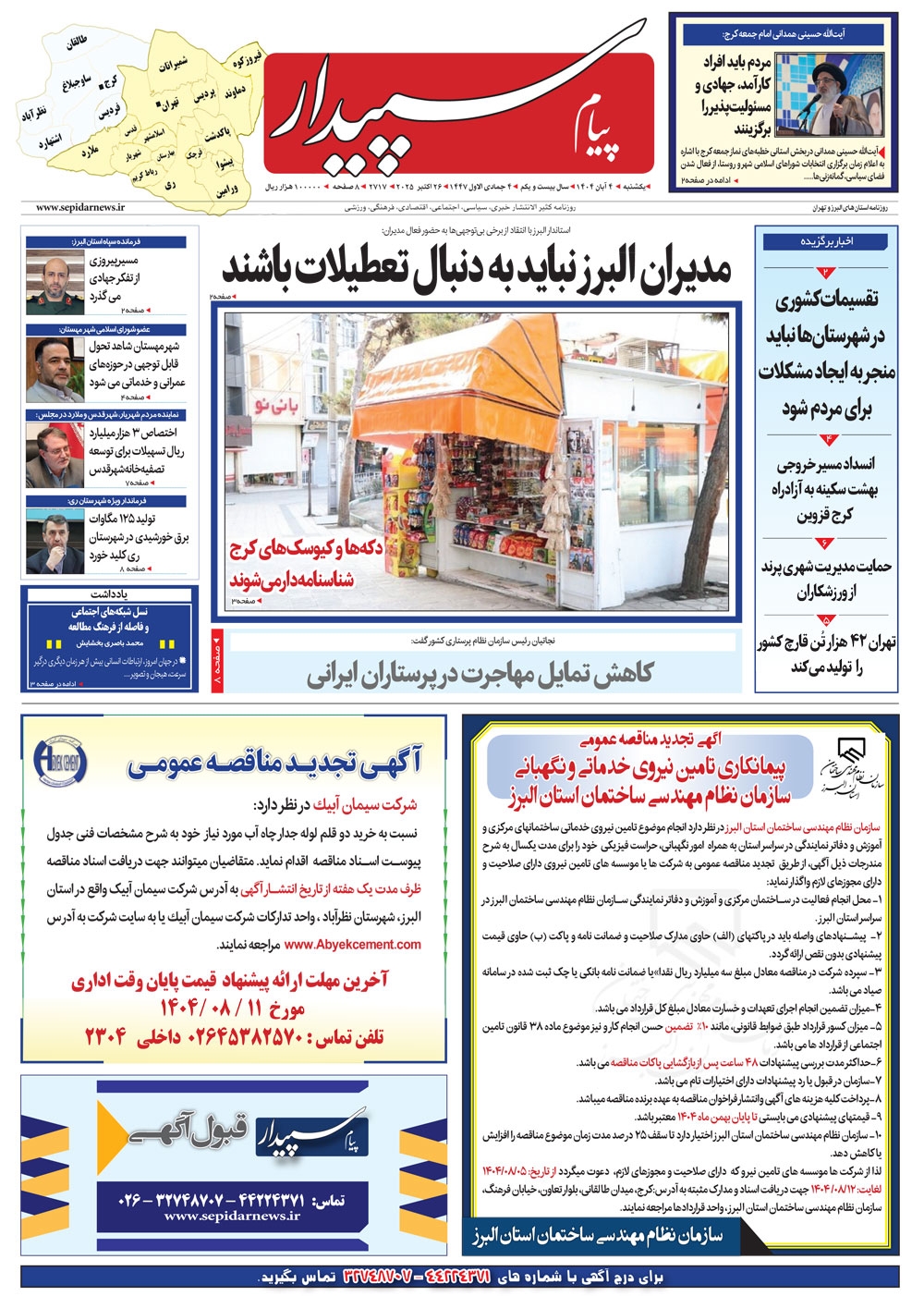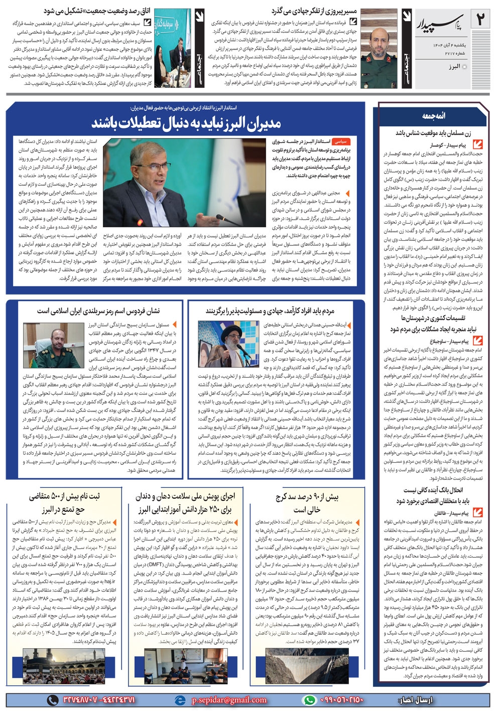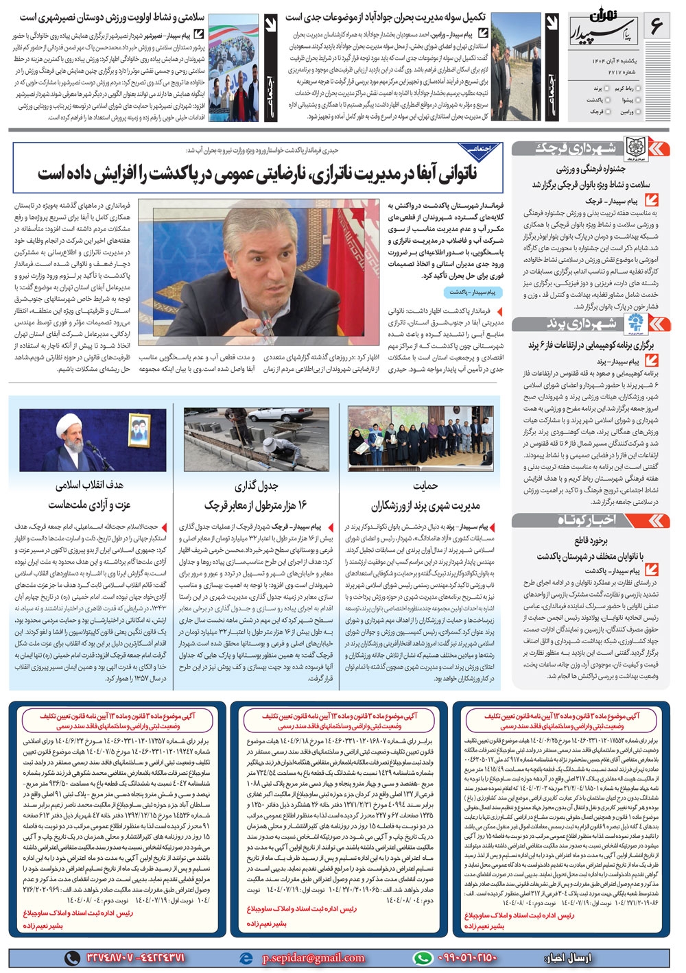 روزنامه پیام سپیدار شماره 2717 یکشنبه چهارم آبان سال هزارو چهارصدو چهار منتشر شد و در دسترس مخاطبین قرار گرفت. روزنامه پیام سپیدار را می توانید از کیوسک های مطبوعاتی سطح شهر تهیه کنید.