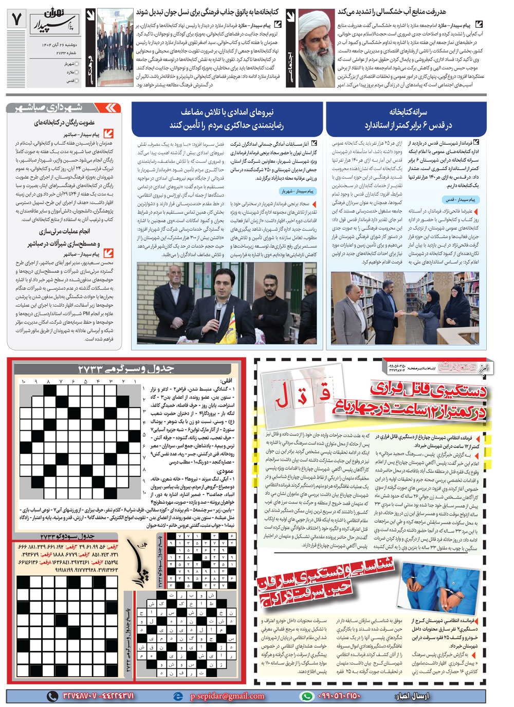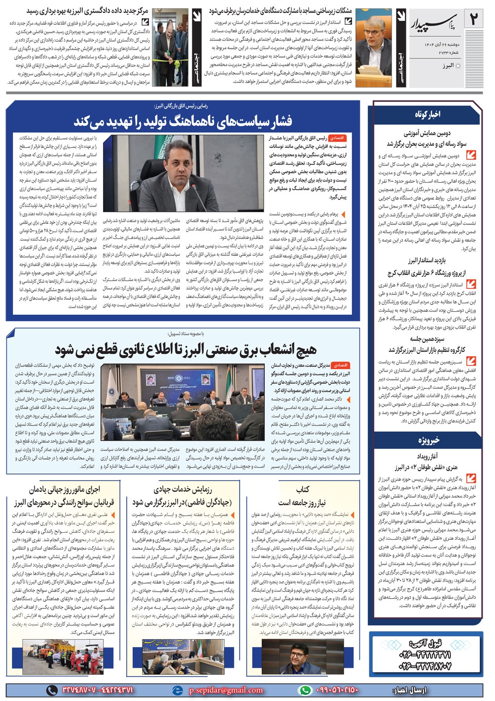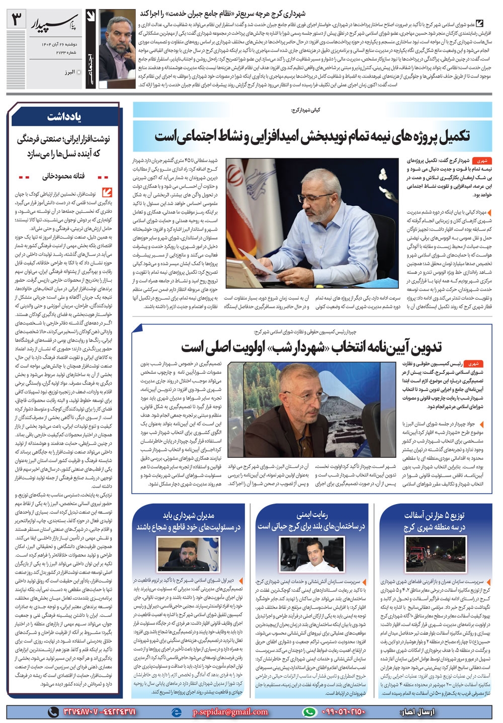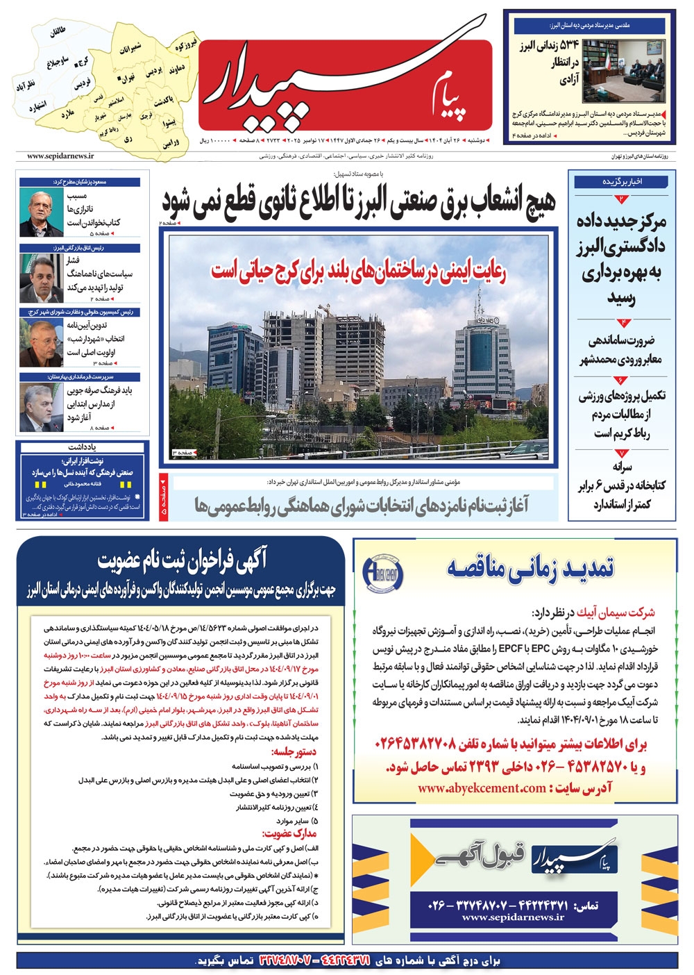 روزنامه پیام سپیدار شماره 2733 دوشنبه بیست و ششم آبان سال هزارو چهارصدو چهار منتشر شد و در دسترس مخاطبین قرار گرفت. روزنامه پیام سپیدار را می توانید از کیوسک های مطبوعاتی سطح شهر تهیه کنید.