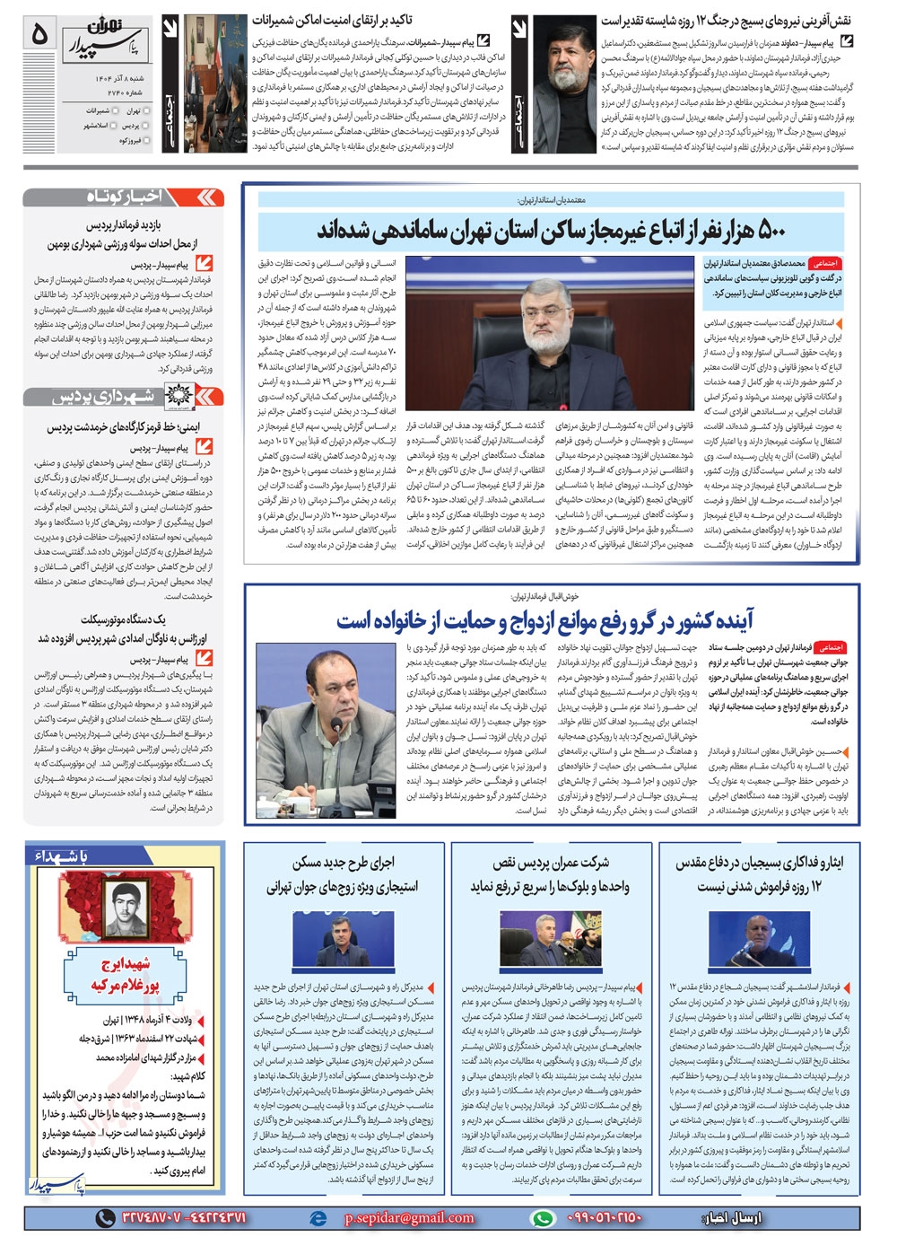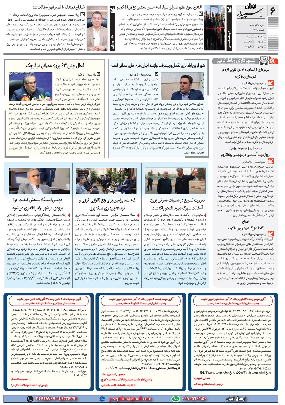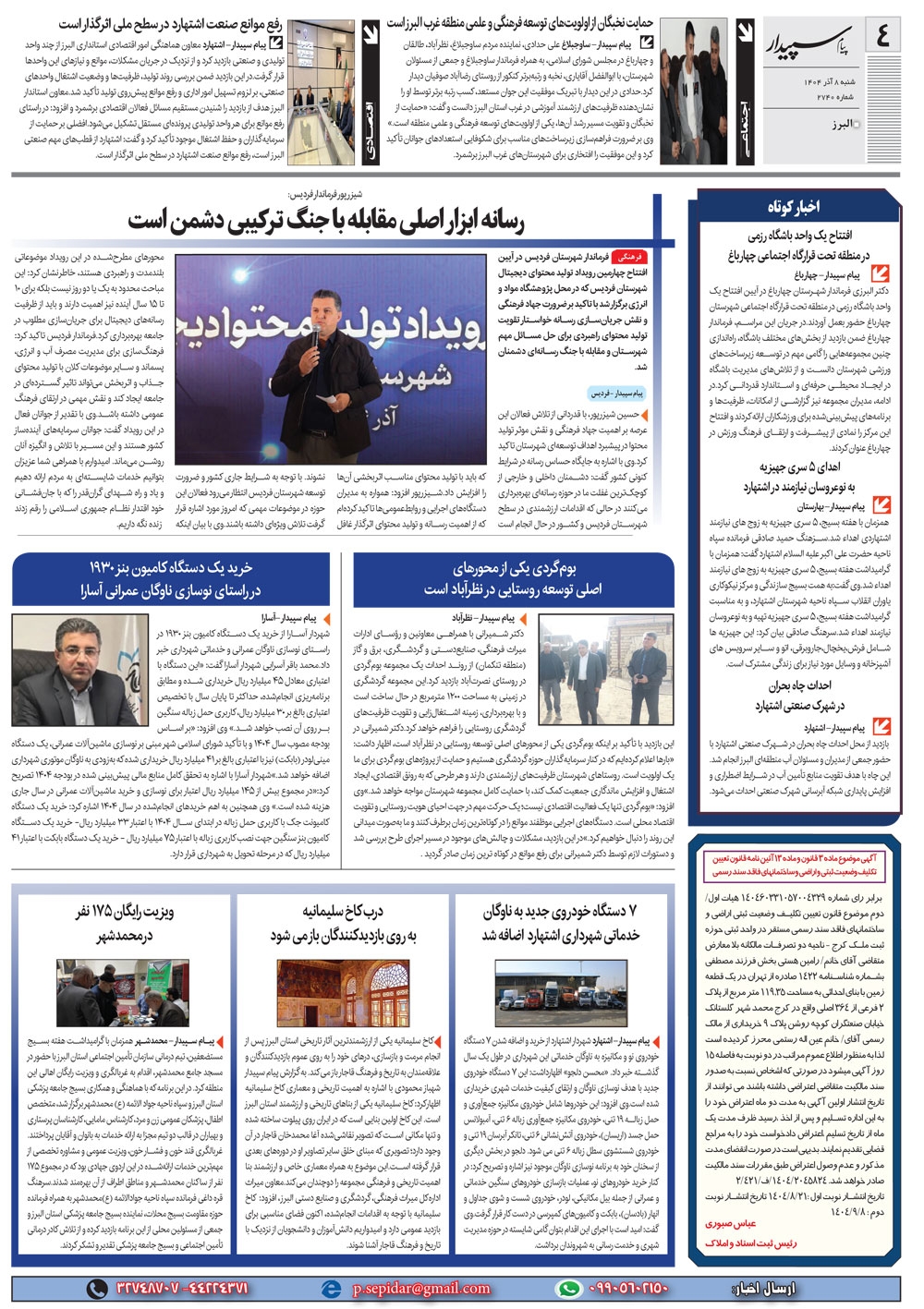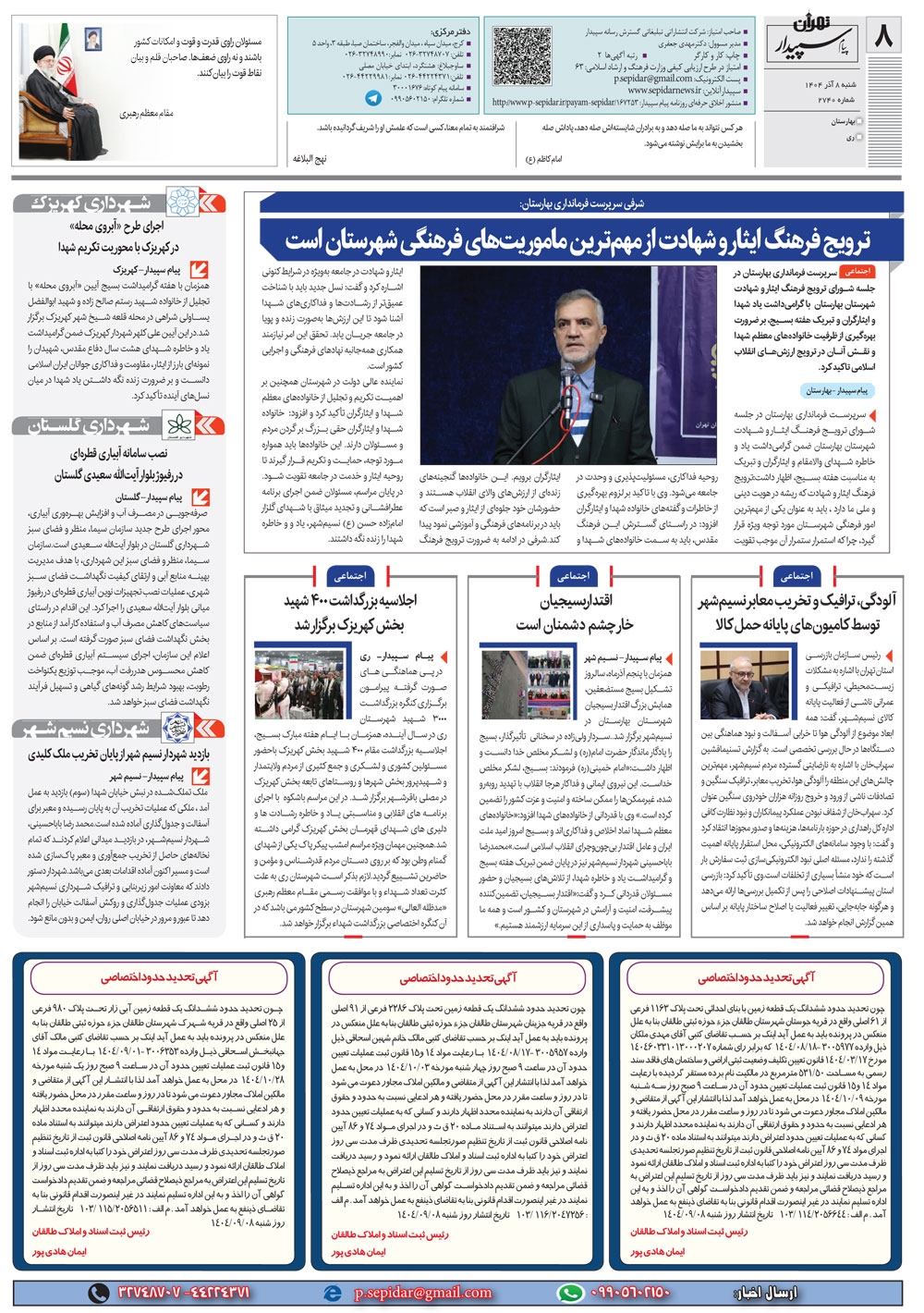 روزنامه پیام سپیدار شماره 2740 شنبه هشتم آذر سال هزارو چهارصدو چهار منتشر شد و در دسترس مخاطبین قرار گرفت. روزنامه پیام سپیدار را می توانید از کیوسک های مطبوعاتی سطح شهر تهیه کنید.