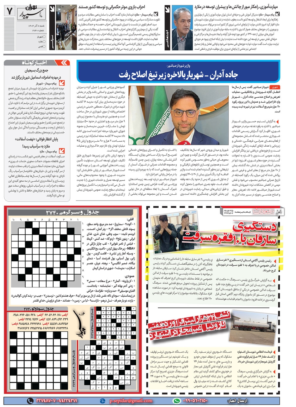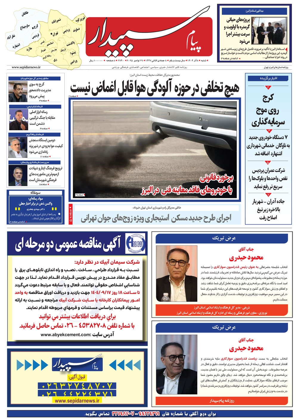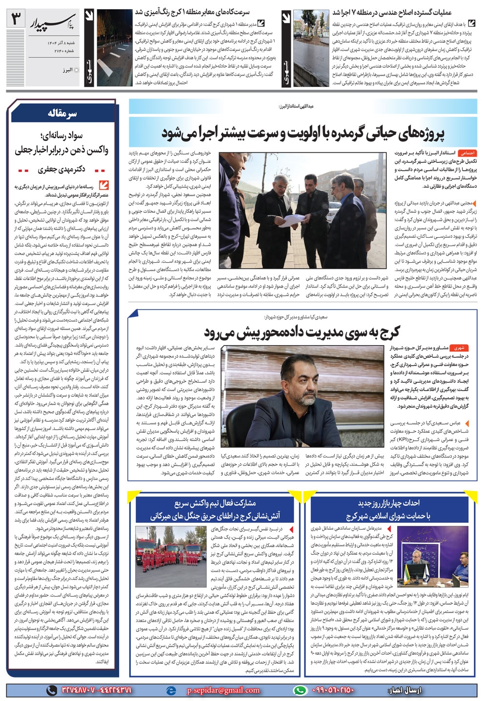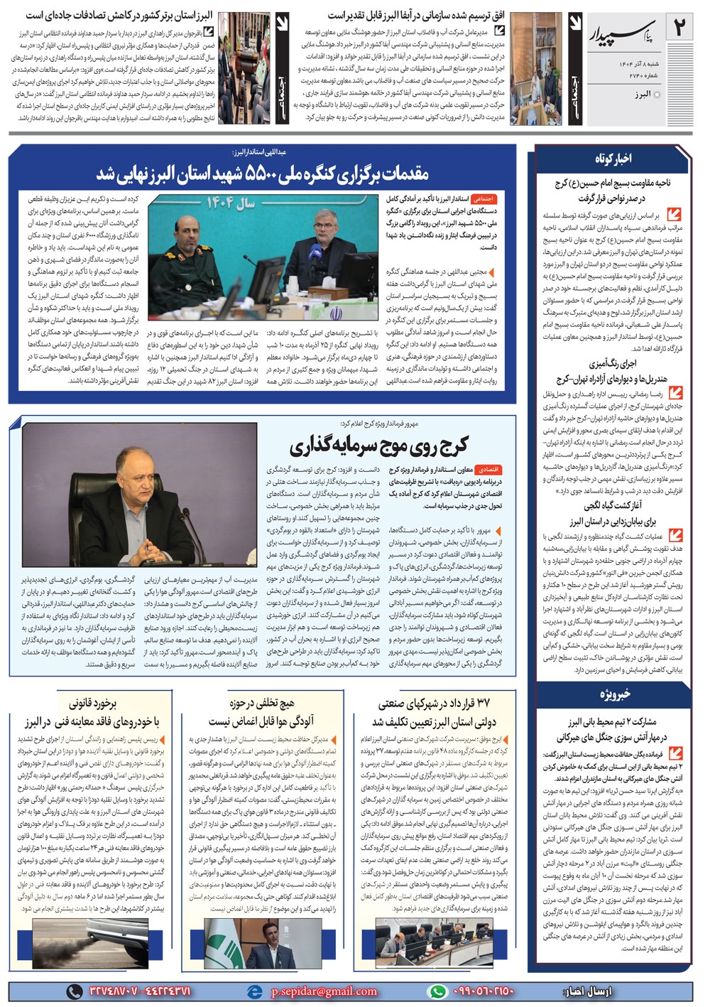 روزنامه پیام سپیدار شماره 2740 شنبه هشتم آذر سال هزارو چهارصدو چهار منتشر شد و در دسترس مخاطبین قرار گرفت. روزنامه پیام سپیدار را می توانید از کیوسک های مطبوعاتی سطح شهر تهیه کنید.