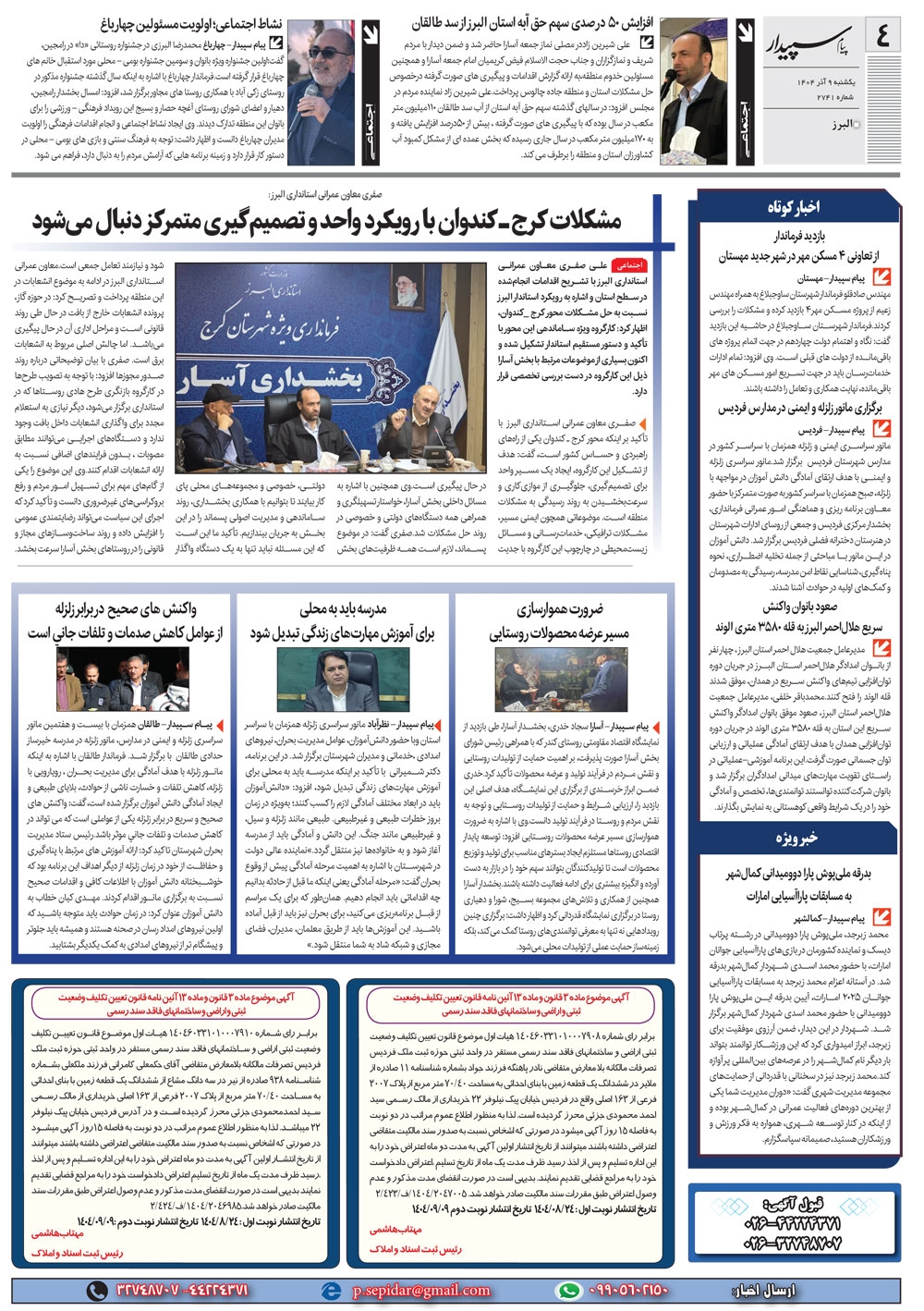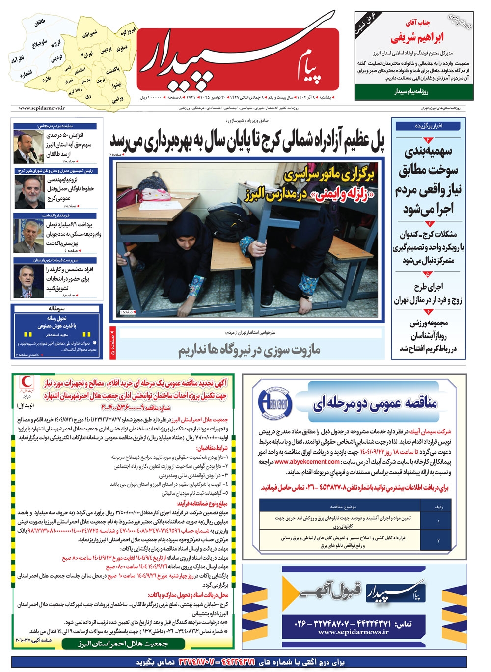 روزنامه پیام سپیدار شماره 2741 یکشنبه نهم آذر سال هزارو چهارصدو چهار منتشر شد و در دسترس مخاطبین قرار گرفت. روزنامه پیام سپیدار را می توانید از کیوسک های مطبوعاتی سطح شهر تهیه کنید.