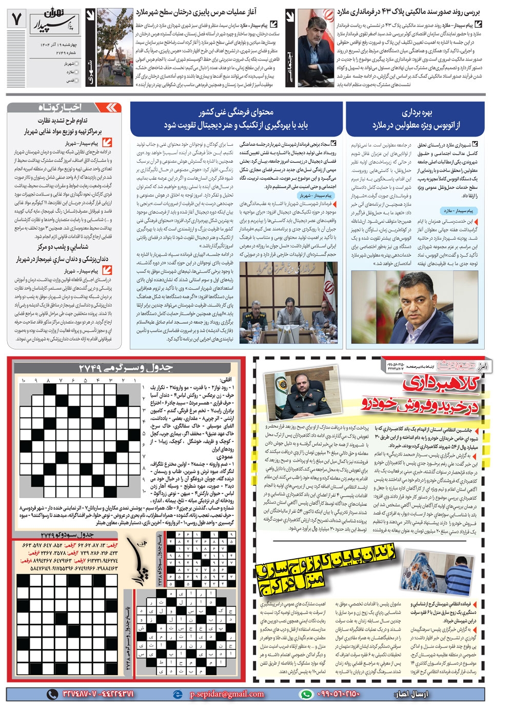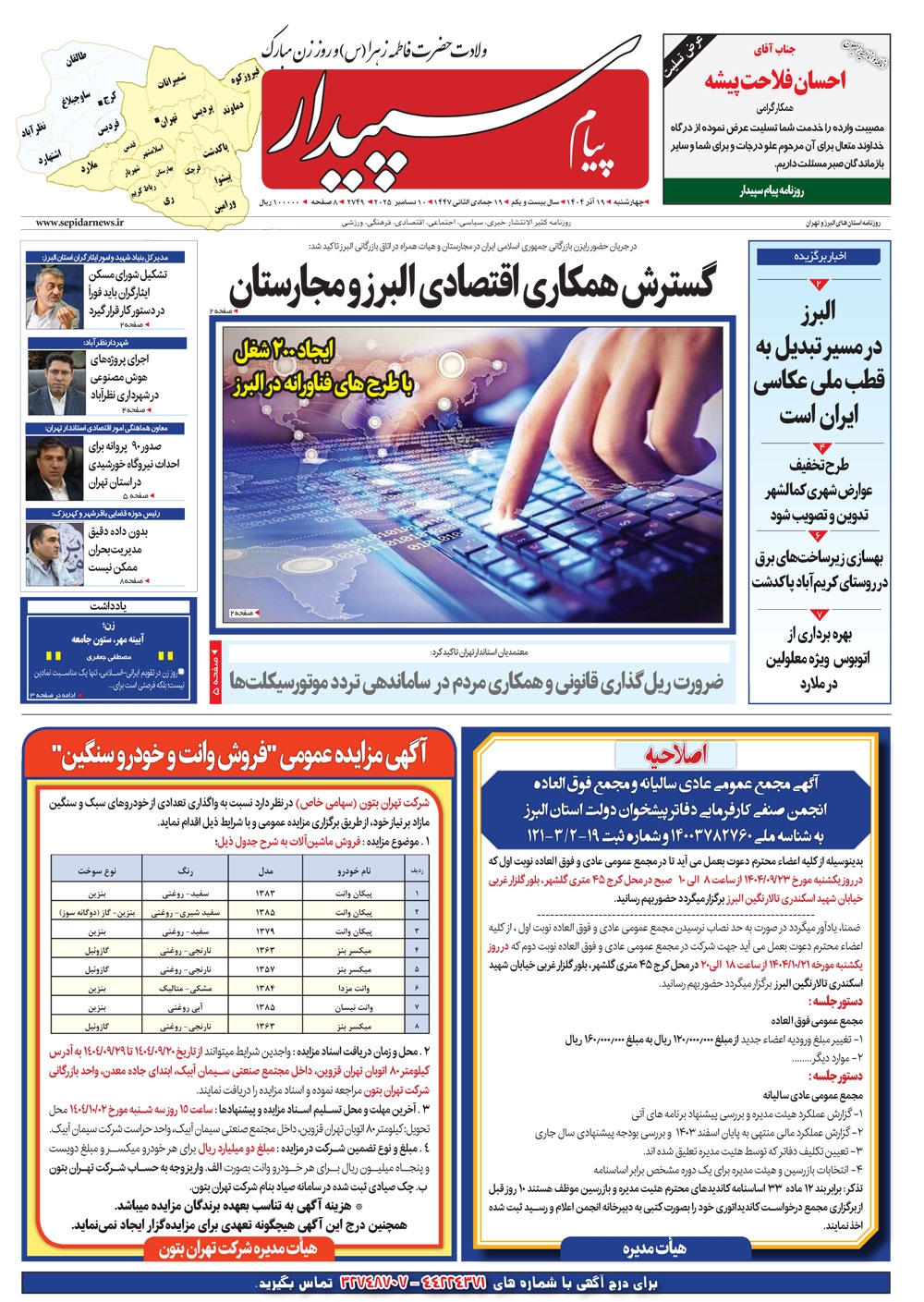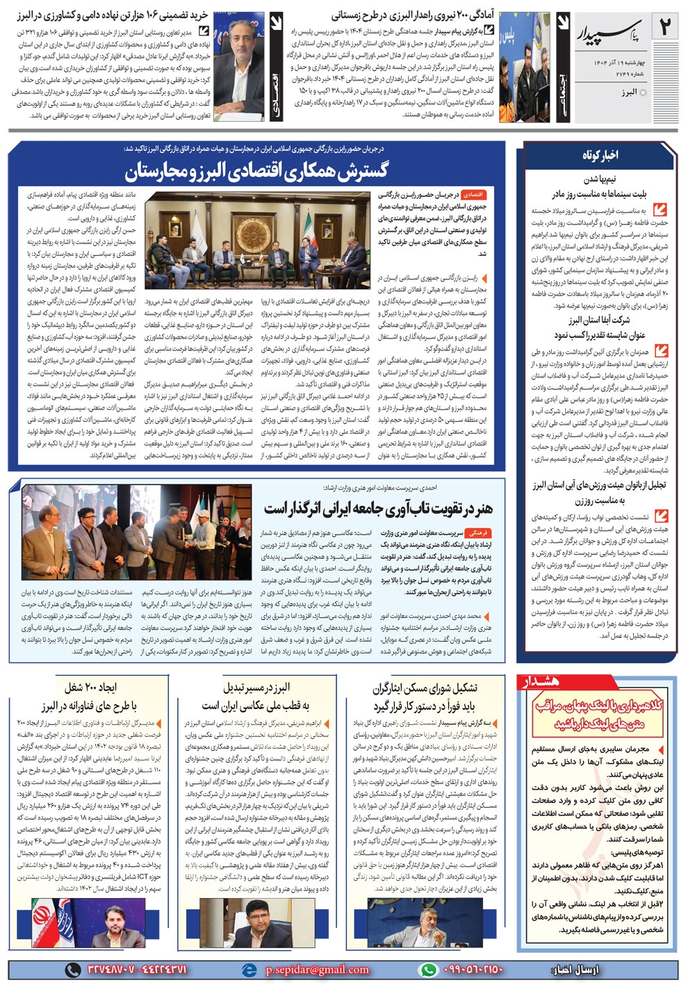 روزنامه پیام سپیدار شماره 2749 چهارشنبه نوزدهم آذر سال هزارو چهارصدو چهار منتشر شد و در دسترس مخاطبین قرار گرفت. روزنامه پیام سپیدار را می توانید از کیوسک های مطبوعاتی سطح شهر تهیه کنید.