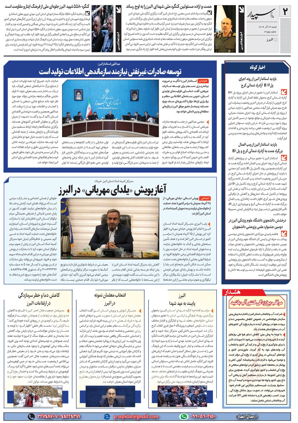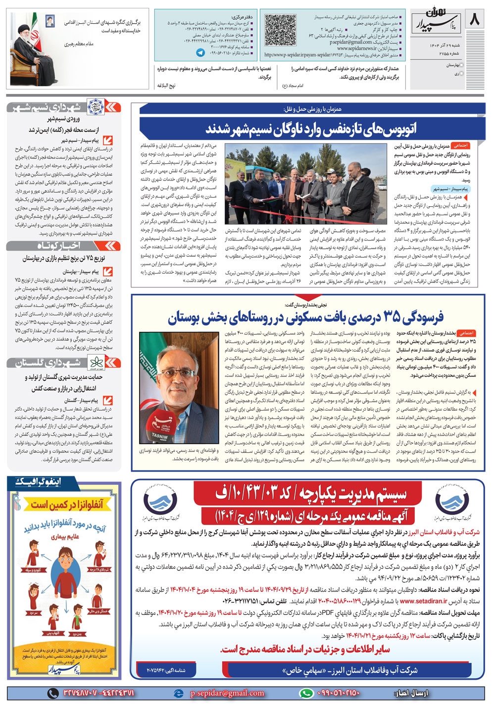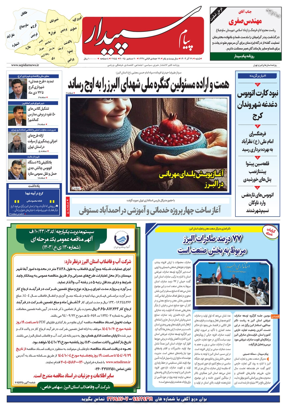 روزنامه پیام سپیدار شماره 2755 شنبه بیست و نهم آذر سال هزارو چهارصدو چهار منتشر شد و در دسترس مخاطبین قرار گرفت. روزنامه پیام سپیدار را می توانید از کیوسک های مطبوعاتی سطح شهر تهیه کنید.