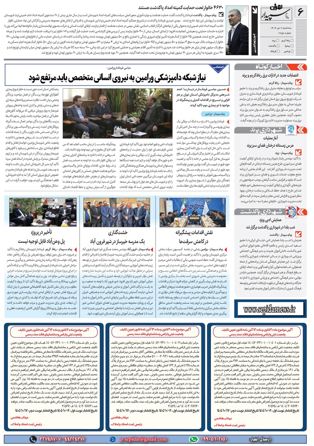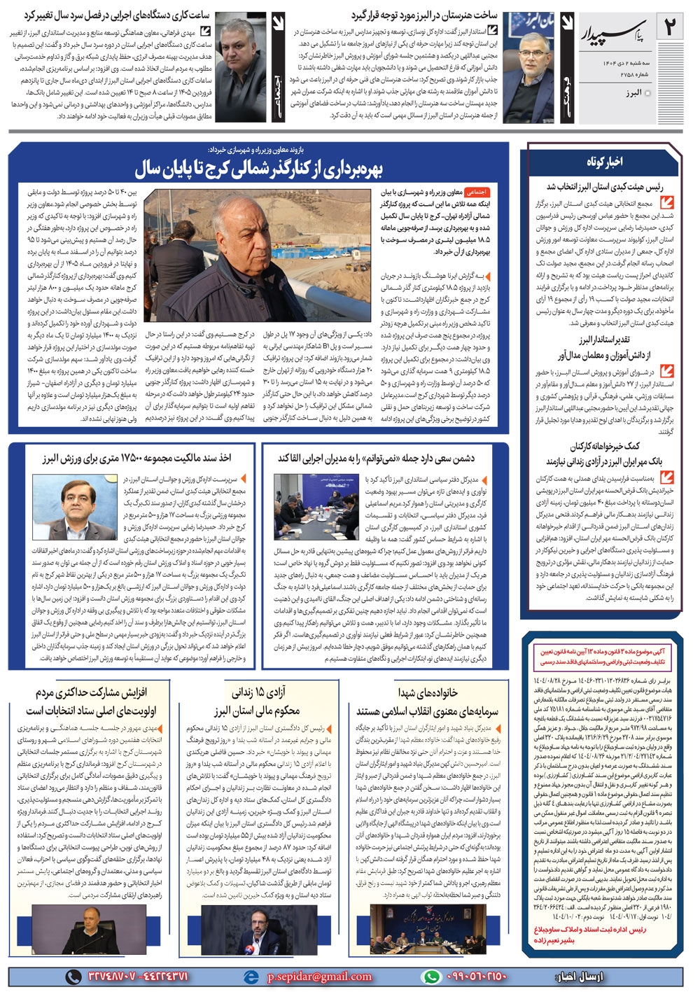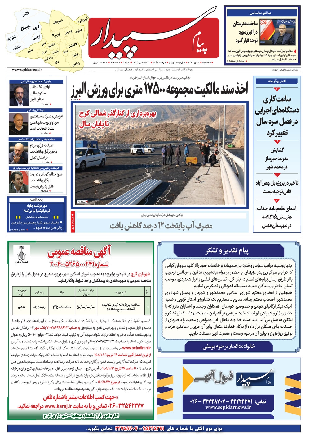 روزنامه پیام سپیدار شماره 2758سه شنبه دوم دیماه سال هزارو چهارصدو چهار منتشر شد و در دسترس مخاطبین قرار گرفت. روزنامه پیام سپیدار را می توانید از کیوسک های مطبوعاتی سطح شهر تهیه کنید.