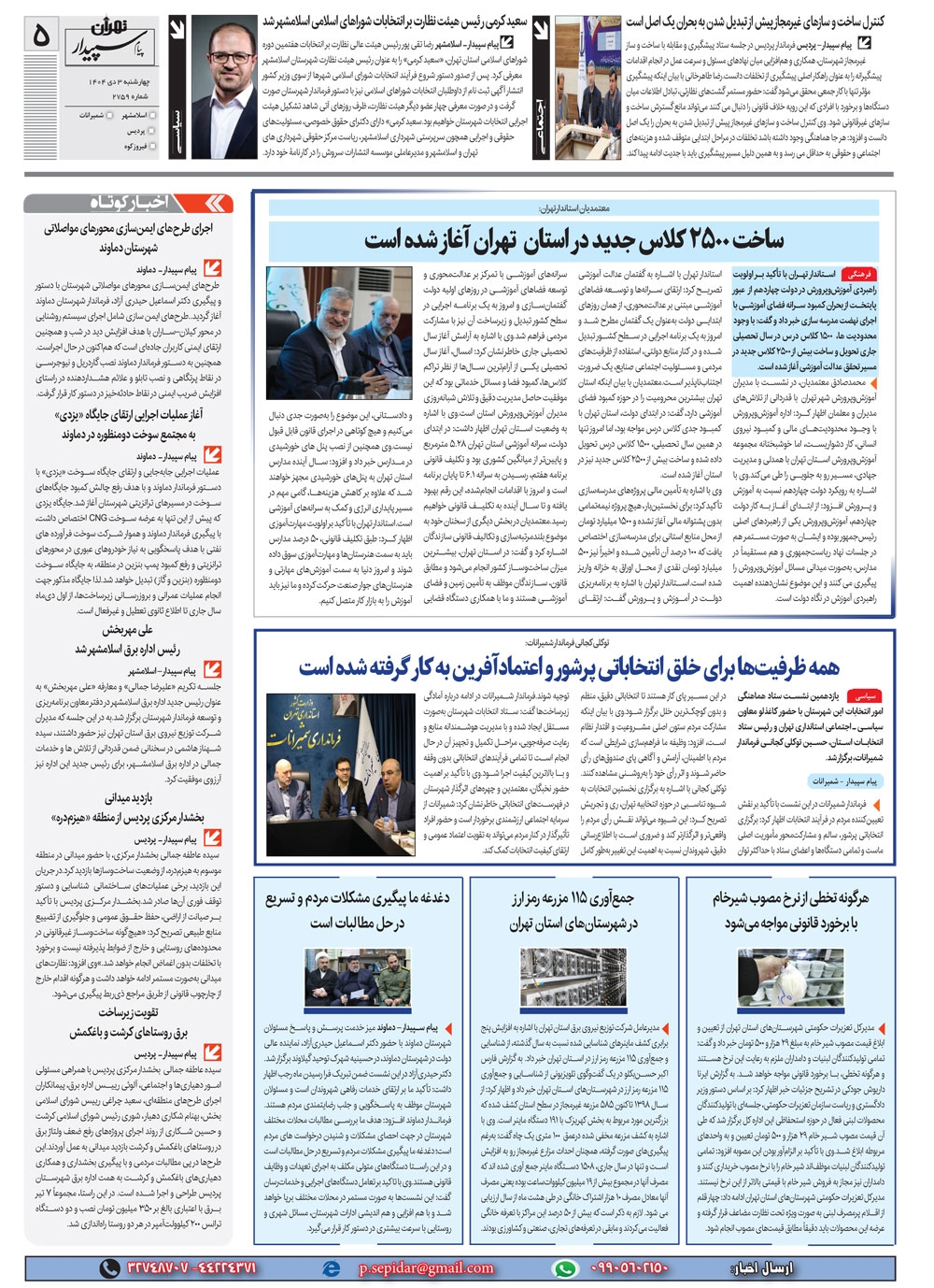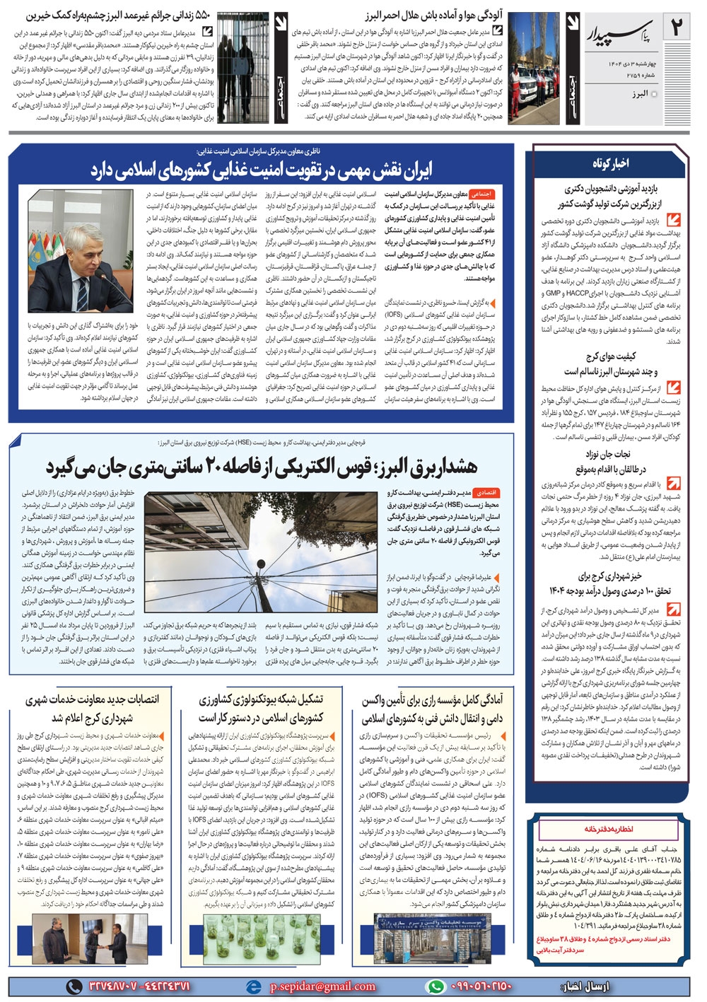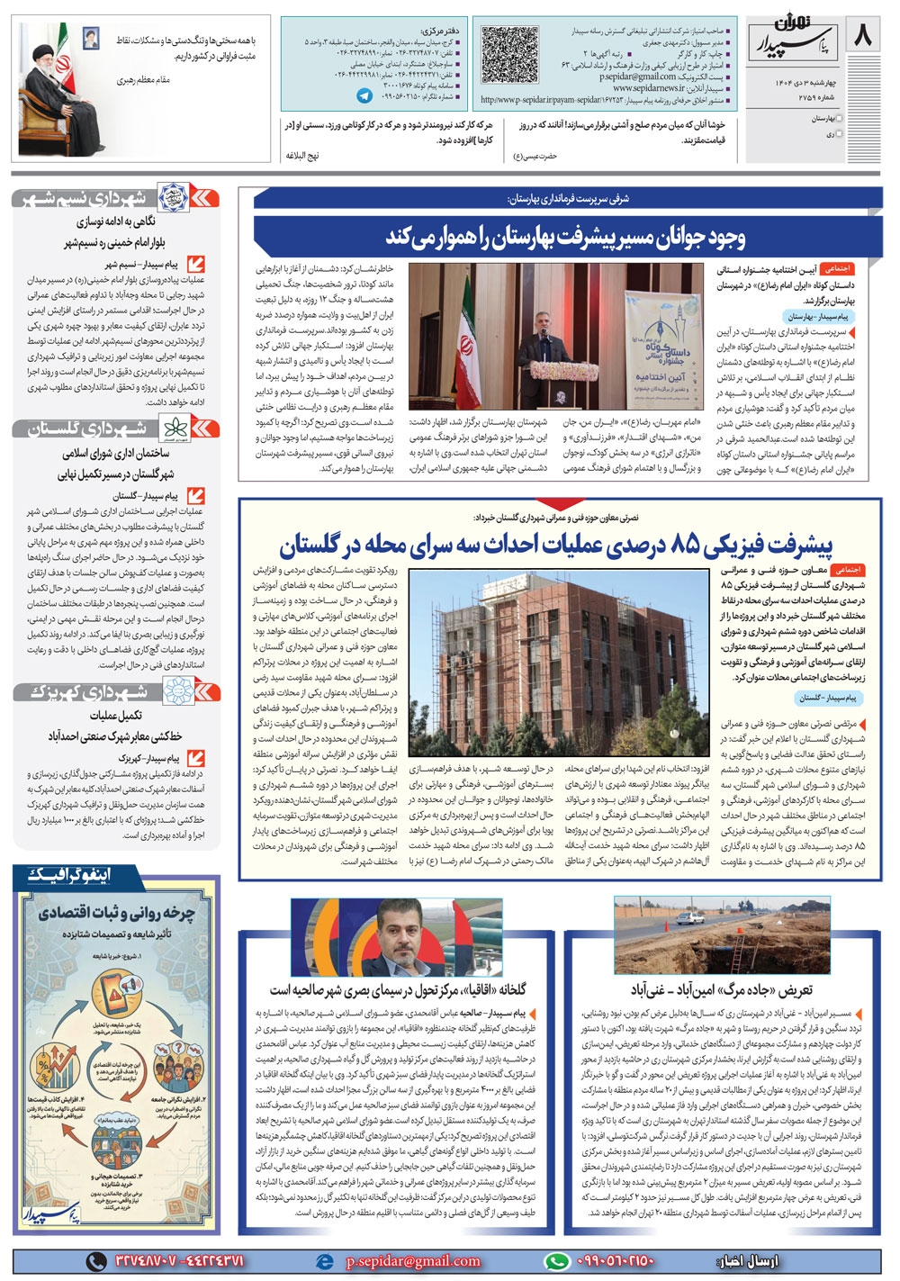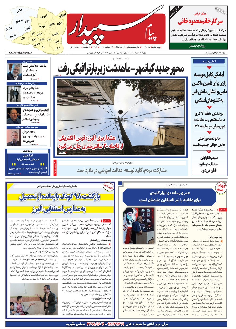 روزنامه پیام سپیدار شماره 2759 چهار شنبه سوم دیماه سال هزارو چهارصدو چهار منتشر شد و در دسترس مخاطبین قرار گرفت. روزنامه پیام سپیدار را می توانید از کیوسک های مطبوعاتی سطح شهر تهیه کنید.