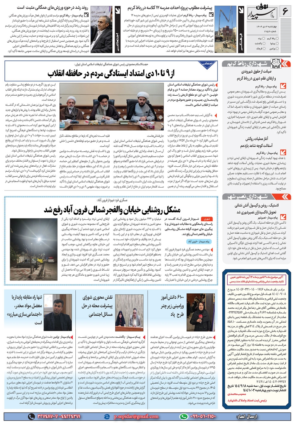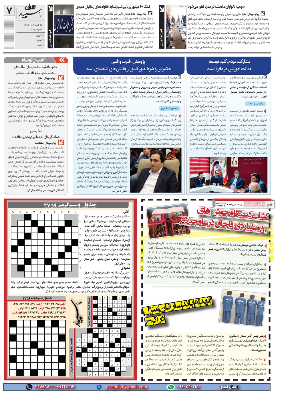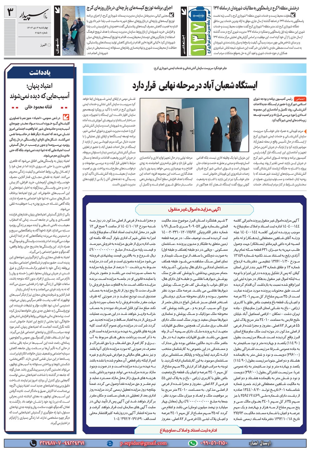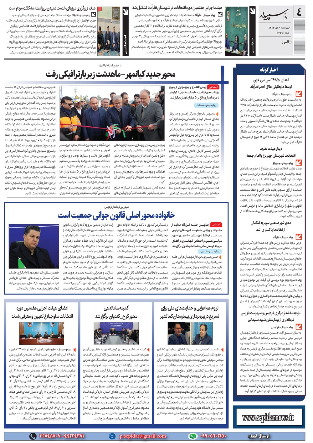 روزنامه پیام سپیدار شماره 2759 چهار شنبه سوم دیماه سال هزارو چهارصدو چهار منتشر شد و در دسترس مخاطبین قرار گرفت. روزنامه پیام سپیدار را می توانید از کیوسک های مطبوعاتی سطح شهر تهیه کنید.
