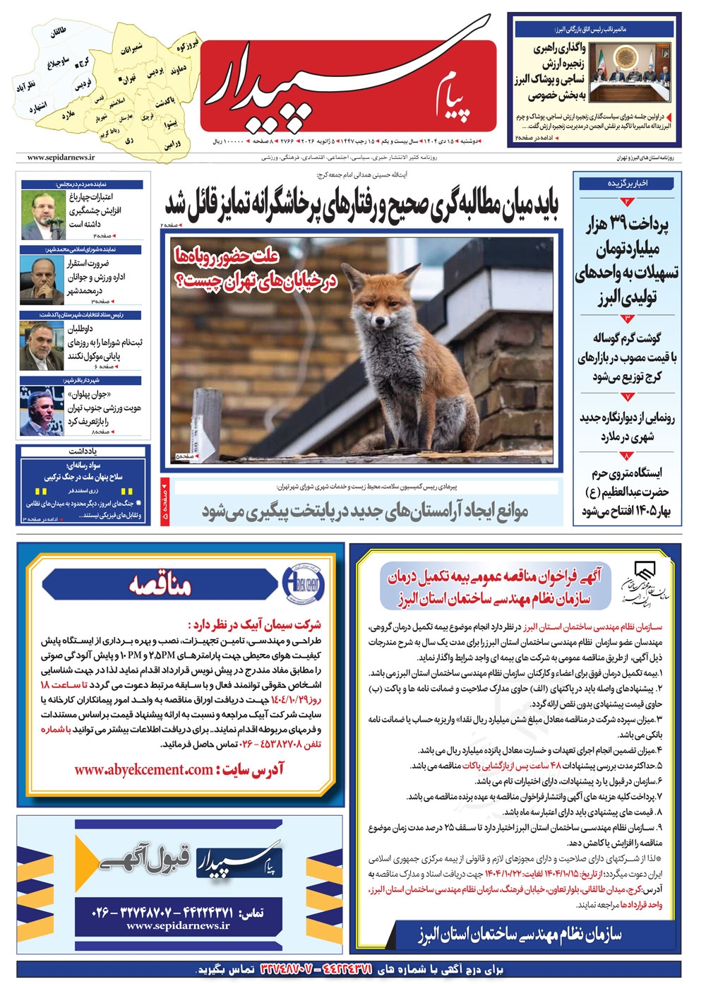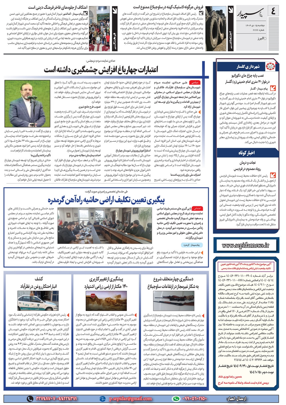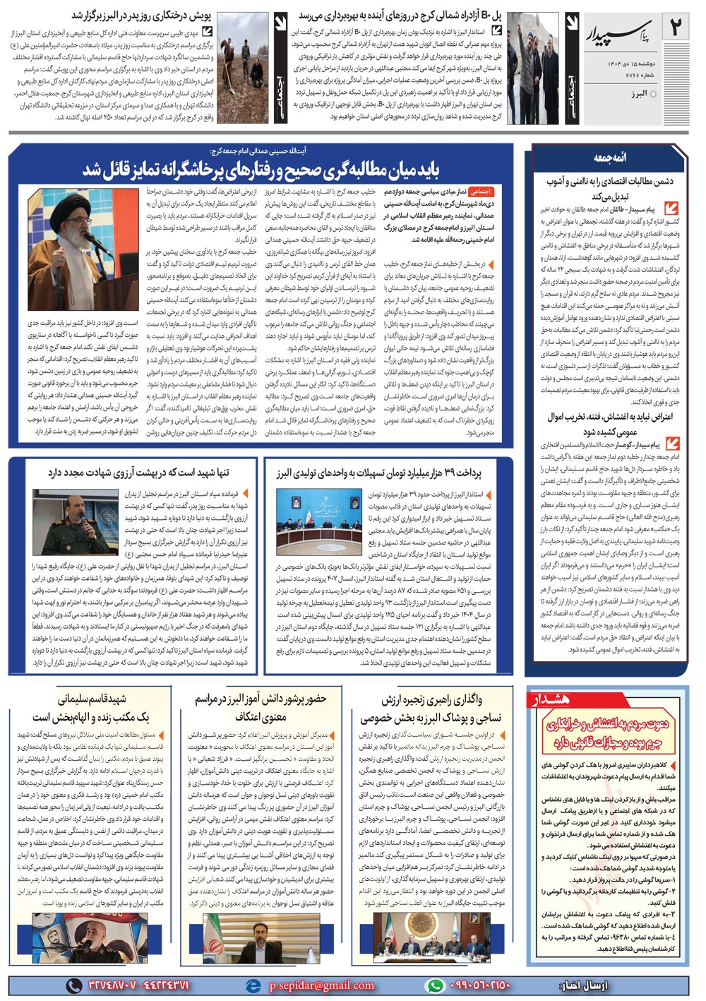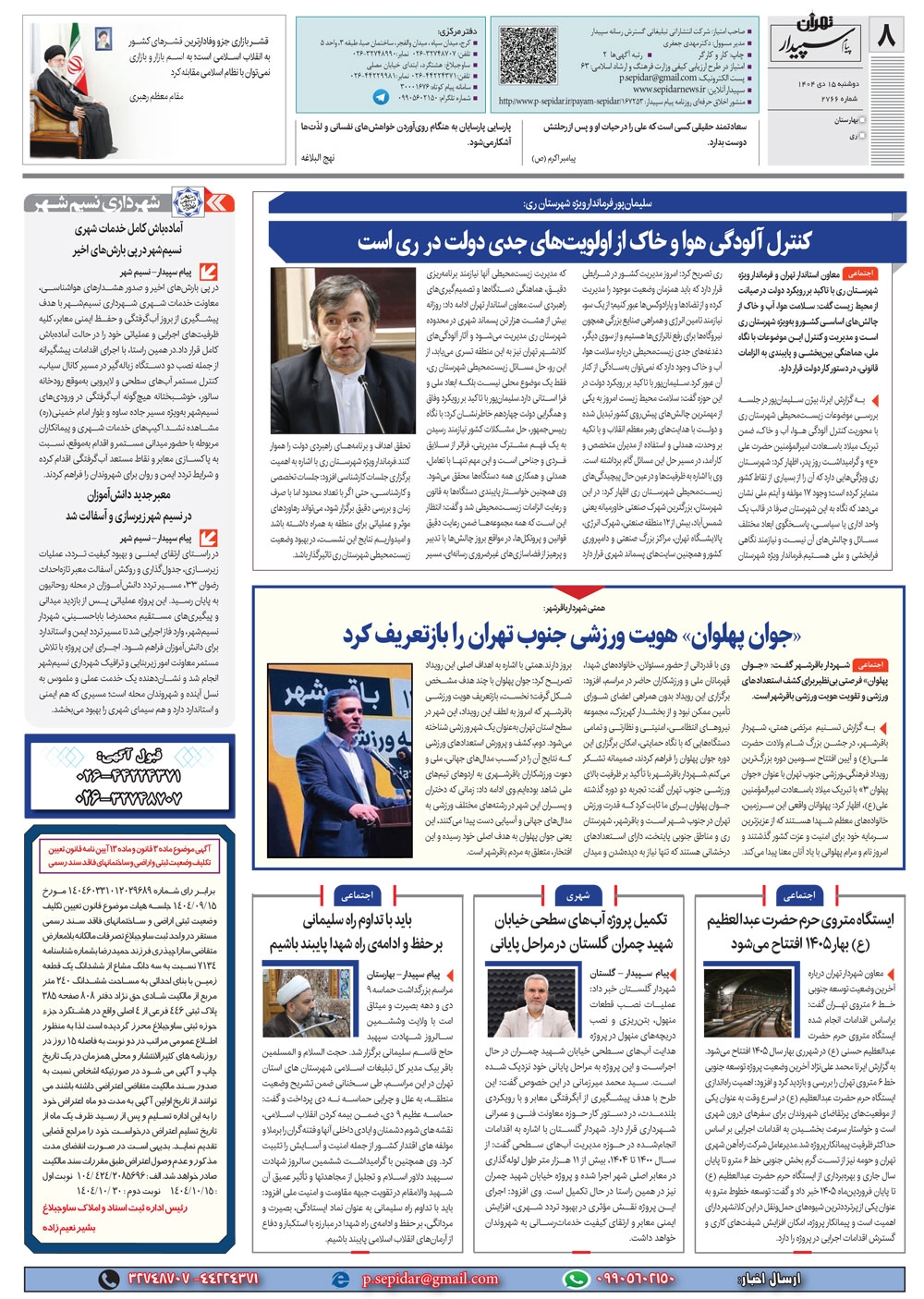 روزنامه پیام سپیدار شماره 2766 دوشنبه پانزدهم دیماه سال هزارو چهارصدو چهار منتشر شد و در دسترس مخاطبین قرار گرفت. روزنامه پیام سپیدار را می توانید از کیوسک های مطبوعاتی سطح شهر تهیه کنید.