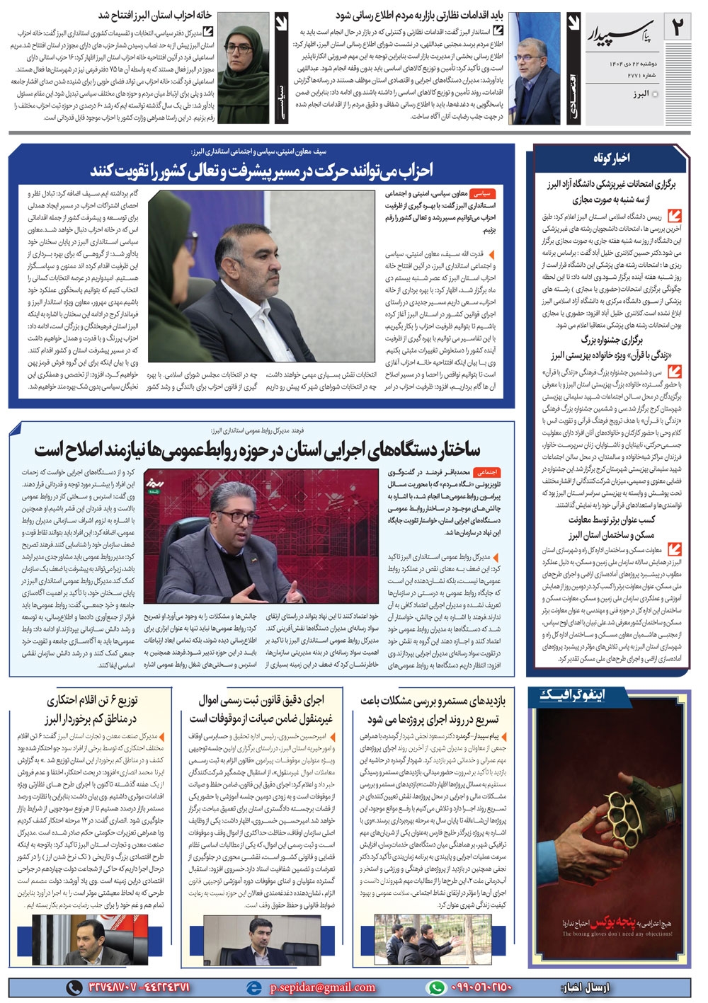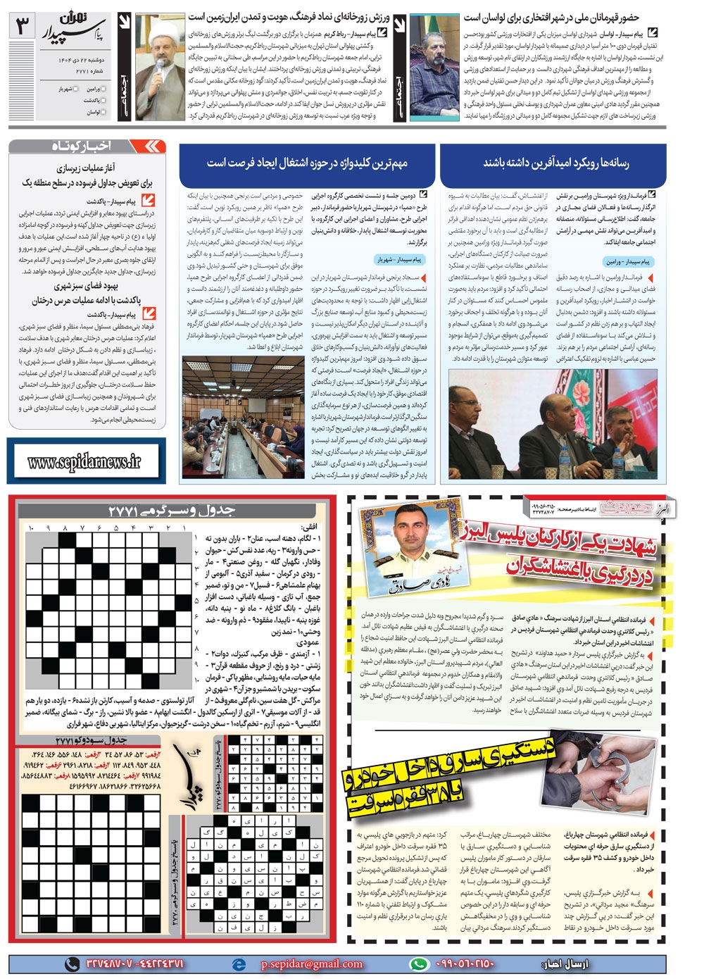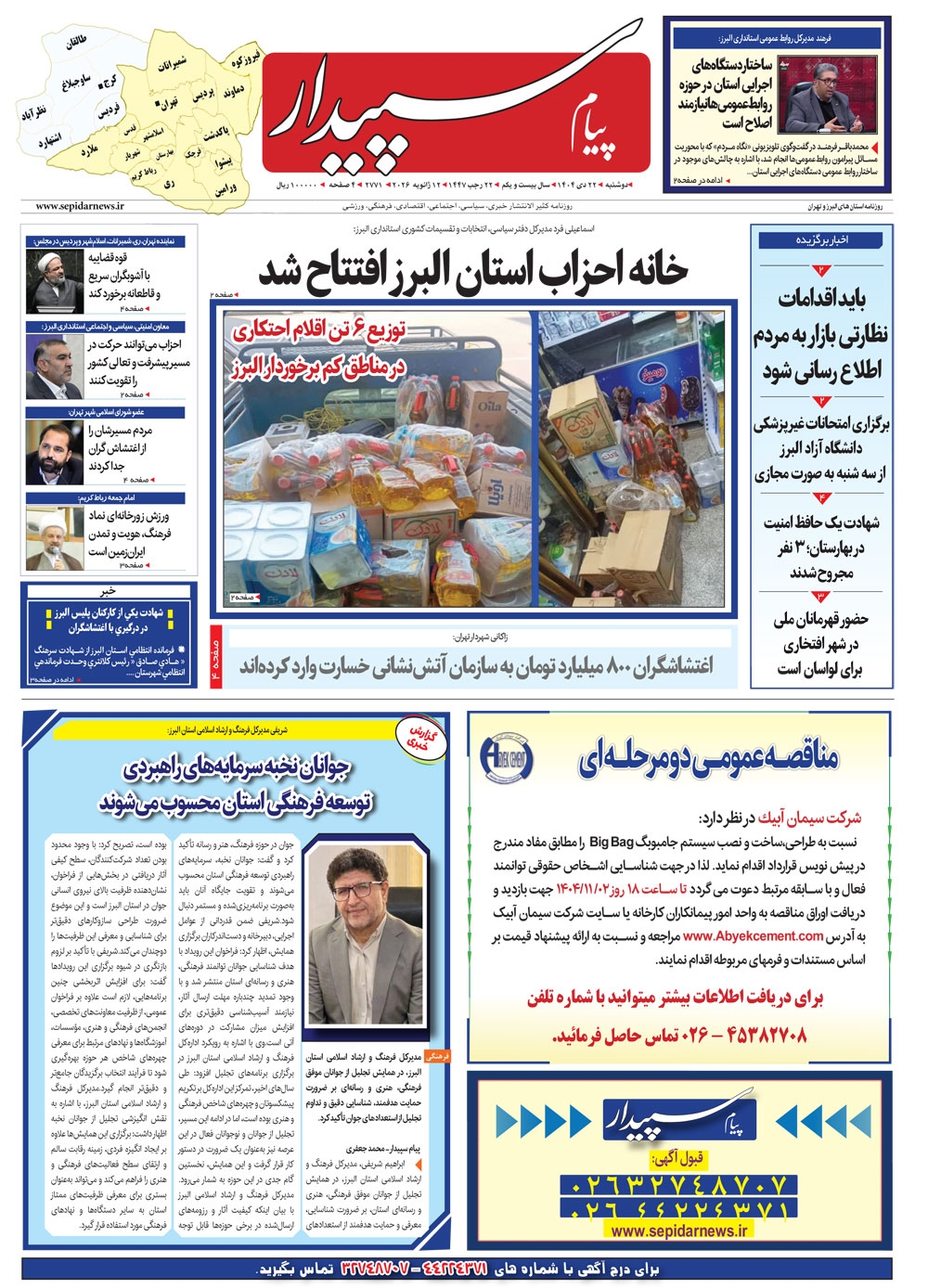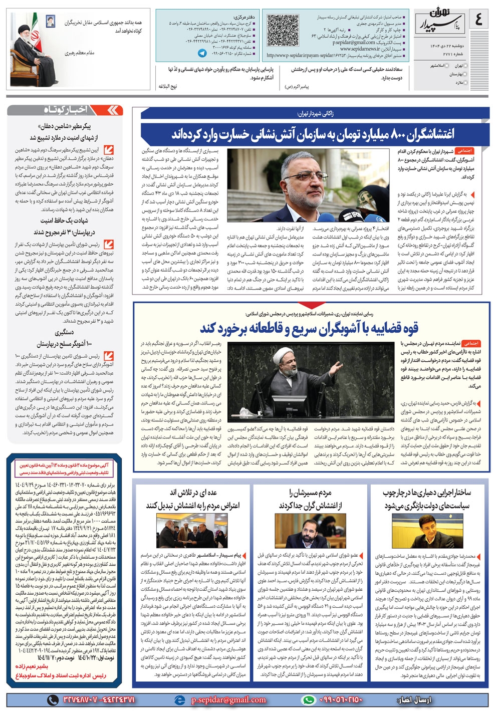 روزنامه پیام سپیدار شماره 2771 دوشنبه بیست و دوم دیماه سال هزارو چهارصدو چهار منتشر شد و در دسترس مخاطبین قرار گرفت. روزنامه پیام سپیدار را می توانید از کیوسک های مطبوعاتی سطح شهر تهیه کنید.