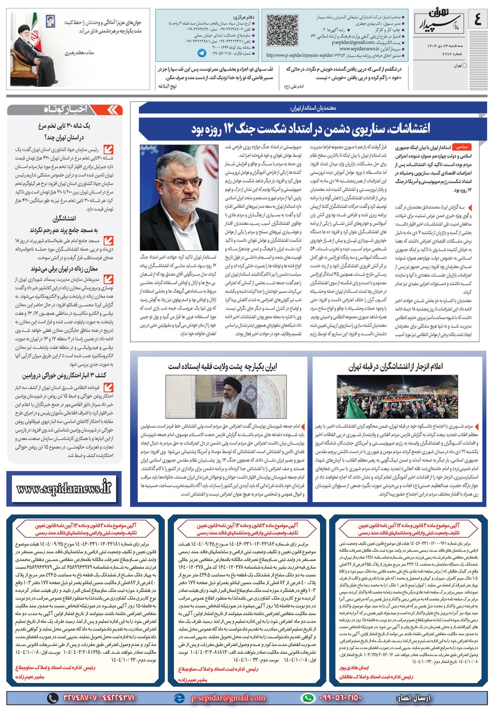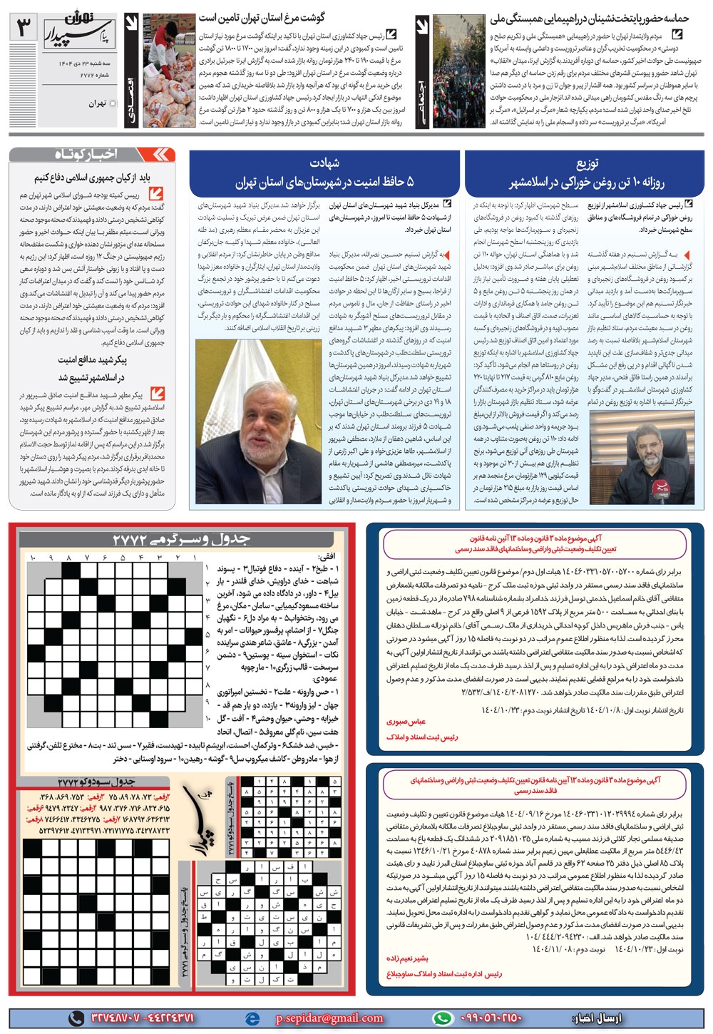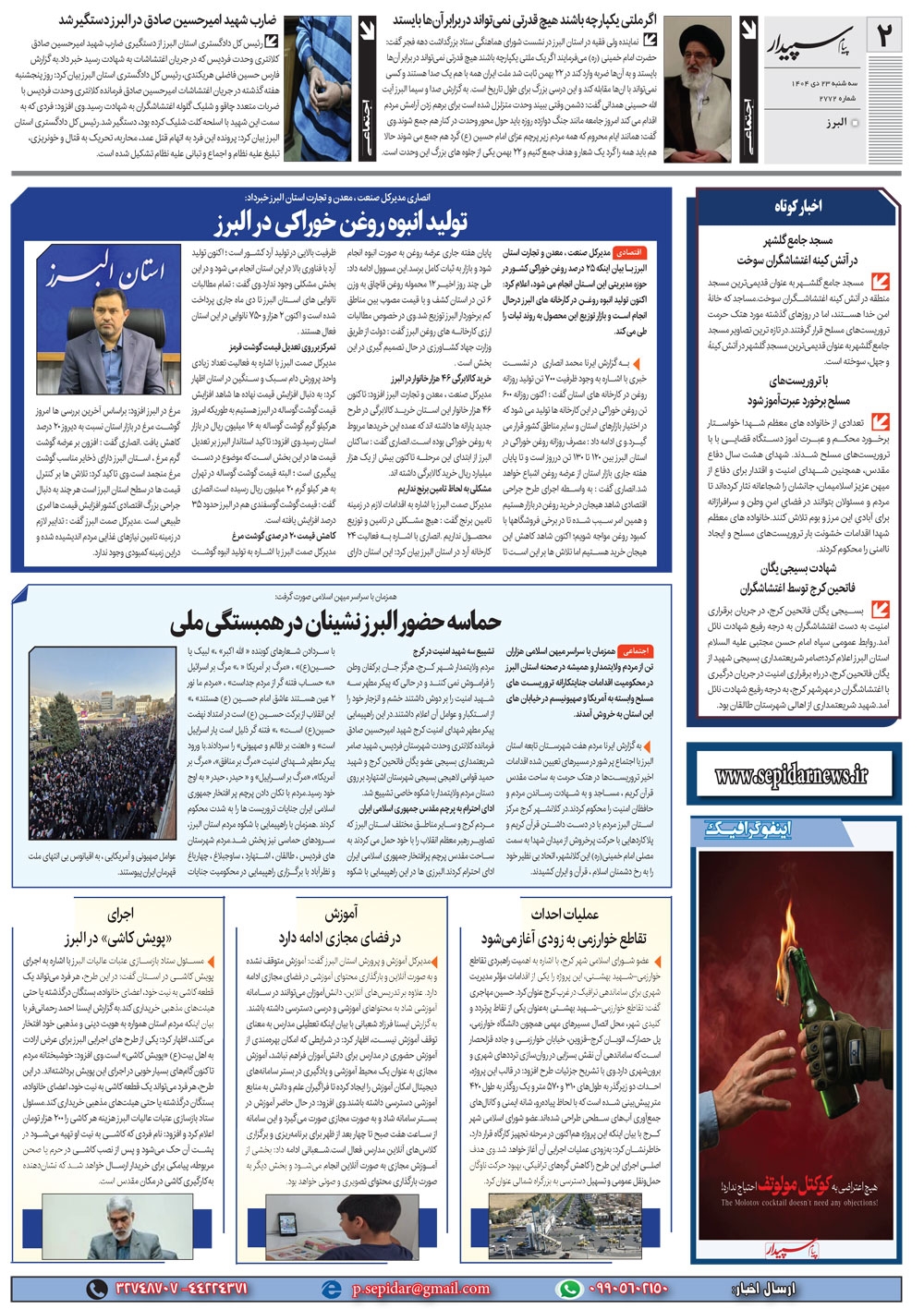 روزنامه پیام سپیدار شماره 2772 سه شنبه بیست و سوم دیماه سال هزارو چهارصدو چهار منتشر شد و در دسترس مخاطبین قرار گرفت. روزنامه پیام سپیدار را می توانید از کیوسک های مطبوعاتی سطح شهر تهیه کنید.